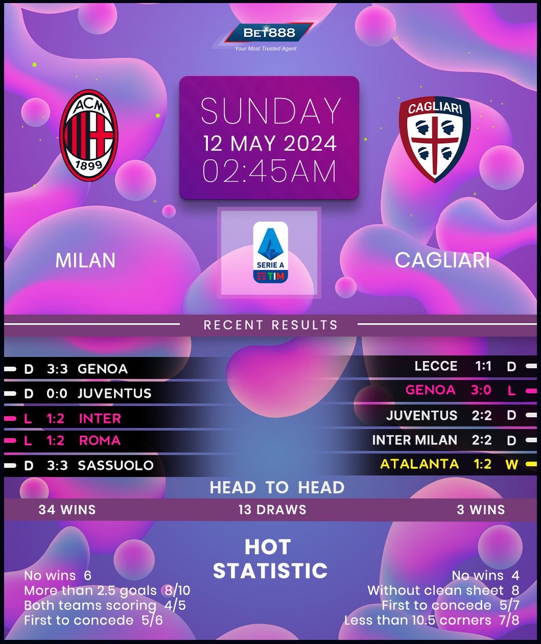 Milan shared the spoils with Genoa in a topsy-turvy 3-3 home draw last weekend, extending their underwhelming winless run in Serie A to four games for the first time this season (D3, L1). Despite failing to win any of their last six competitive outings (D3, L3), ‘I Rossoneri’ ought to be confident about ending their season on a high, having won ten of their 12 most recent meetings with Cagliari (D2), with four of their six home triumphs in that period yielding a three-goal margin. Replicating that success would see Stefano Pioli’s side secure a runner-up finish with two games to spare. However, Milan can’t take anything for granted after only winning twice in their last five home league games (D2, L1).