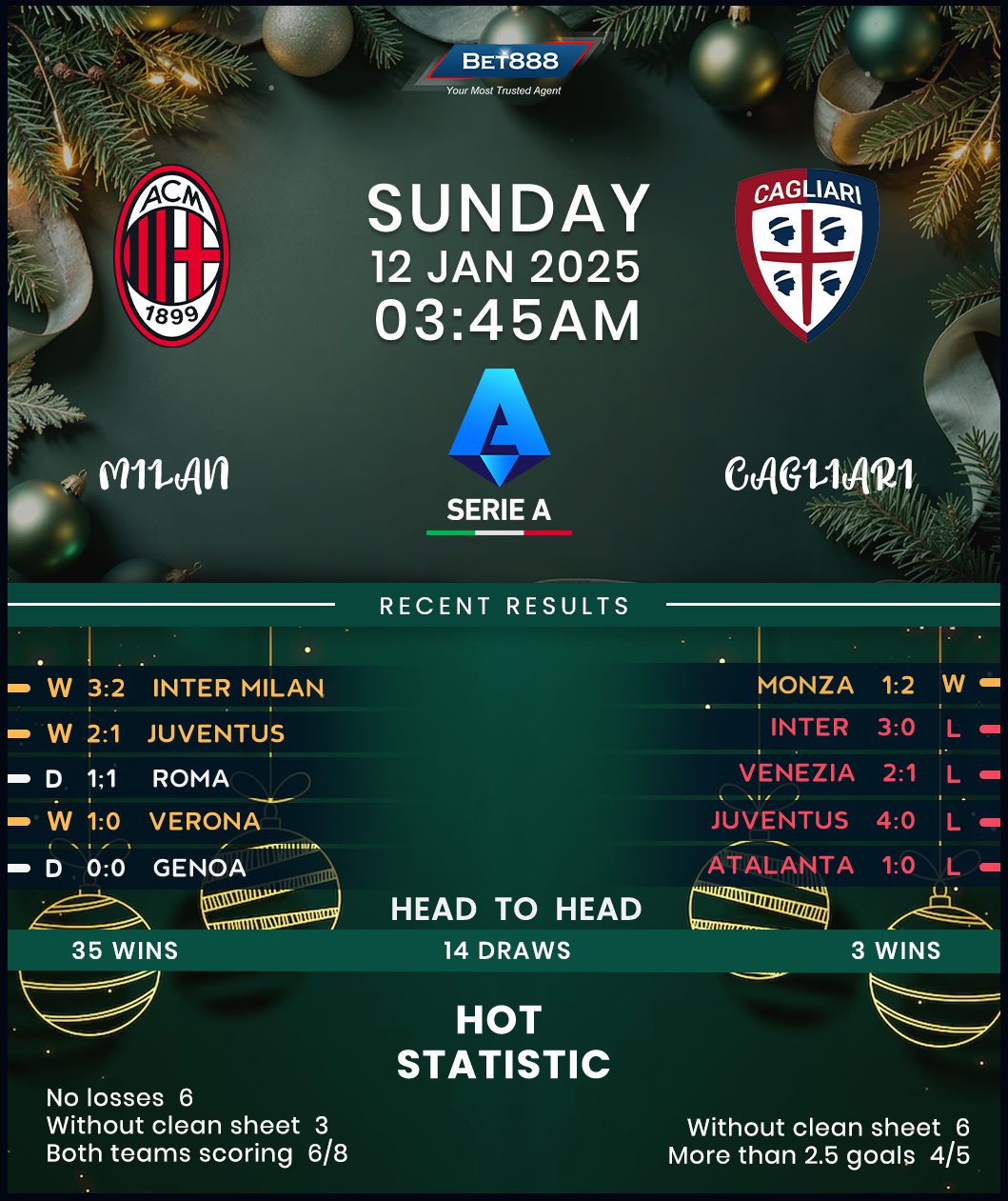 Milan’s resurgence under Conceicao spells trouble for visiting Cagliari, who came from behind to beat rock-bottom Monza 2-1 in their first Serie A game this year, steering clear of 18th-placed Lecce on goal difference alone. Finding an early breakthrough could optimize Cagliari’s chances of pulling off only their second victory against Milan in the 21st century (W1, D9, L29), as they’ve avoided defeat in all six league games when opening the scoring this season (W3, D3). One of those occasions was in November’s reverse fixture when the Islanders squandered an early lead in a goal-glutted 3-3 draw in Sardinia. However, Cagliari’s recent visits to San Siro have yielded nothing but doom and gloom, with Davide Nicola’s side losing their last three away H2Hs by 4+ goals ‘to one.’