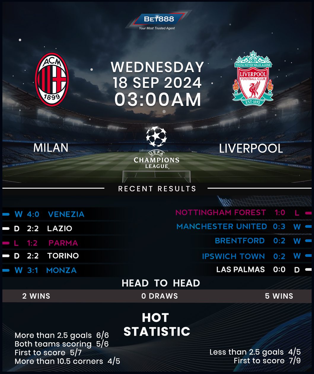 Unlike his Milan counterpart, new Liverpool boss Arne Slot couldn’t have hoped for a better way to kick off his Anfield tenure as he won his opening three Premier League games in charge without conceding. However, the Reds didn’t have the preparation for this fixture they wanted as minnows Nottingham Forest triumphed 1-0 on Merseyside at the weekend. Liverpool competed in the Europa League last season and slumped to a 3-1 aggregate loss to Milan’s domestic rivals Atalanta in the quarter-finals despite winning the away leg 1-0. That victory at least solidified their recent record in Italy, making it four wins from their last five visits to the country (L1). The Reds will be confident of adding to that tally after emerging victorious from eight of their last ten Champions League away matches (L2).