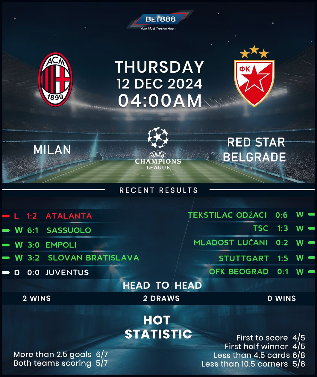 After back-to-back defeats to Liverpool and Bayer Leverkusen to start their European adventure under Paulo Fonseca, Milan have gone into overdrive, winning their last three Champions League games against Club Brugge, Slovan Bratislava, and Real Madrid. ‘I Rossoneri’ notably netted precisely three goals in each victory, though it’s worth noting none of those triumphs yielded a clean sheet. Defensive frailties have plagued the 19-time Italian champions’ attempt to establish consistency under Fonseca, with a 2-1 Serie A defeat at Atalanta last weekend exposing Milan’s vulnerabilities at the back. However, the hosts are well-positioned to claim three precious points and consolidate their hopes of securing automatic knockout qualification, having avoided defeat in all six previous H2H meetings with Red Star (W2, D4).