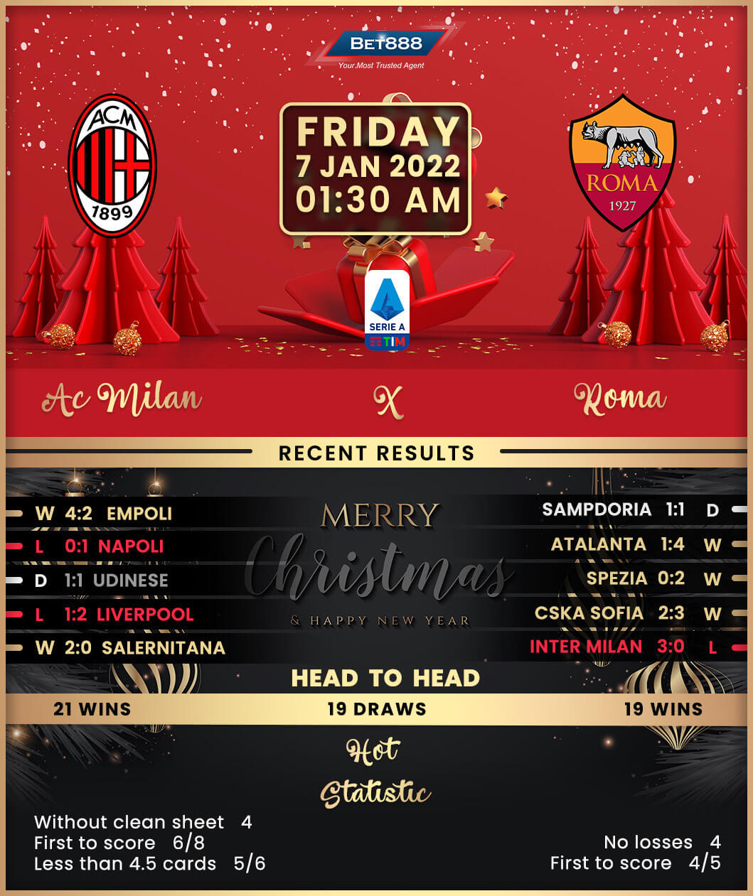 Meanwhile, after falling to a 2-1 loss in the reverse fixture in October, their third Serie A H2H defeat in a row, Roma could lose four top-flight meetings with Milan for the first time since 1996. Keen to avoid that scenario, ‘I Giallorossi’ will look to build on their stunning 4-1 victory at Atalanta in their most recent Serie A travel, as they face the opportunity to register back-to-back league wins away from home for the first time since August 2020. Indeed, Roma’s underwhelming away performances throughout 2021 saw them lose 12 Serie A away games, their worst tally across a single calendar year since 1950. But if they win here, it is likely to be in style, as three of their four away league triumphs this season have come by at least a two-goal margin.