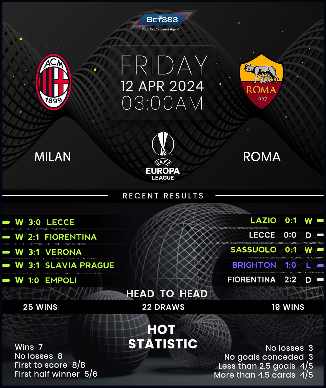 On the other hand, Roma’s road to the quarter-finals hasn’t been straightforward as they squeaked past Feyenoord on penalties before a 4-1 aggregate win against Brighton in the previous round. However, there’s no shortage of confidence around Daniele De Rossi’s camp, especially after beating arch-rivals Lazio 1-0 at the weekend. Despite their storied domestic history, ‘I Giallorossi’ lament a negative continental record against fellow Italian opponents (W1, D1, L2), though this is their first European clash against Milan. Worryingly for the visitors, a single win from their last nine away games on the continental front (D4, L4) significantly derails their chances of posting their first victory at San Siro since 2017. They’ve since lost four of their six away matches against Milan (D2), conceding multiple goals on each occasion.