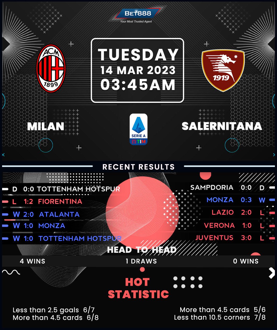 AC Milan stood their ground to hold Tottenham Hotspur to a goalless draw in London in midweek Champions League action, defending a slender first-leg lead to reach the competition’s quarter-finals for the first time in over a decade. So the spirits must be high in the home camp, even though last weekend’s 2-1 defeat at Fiorentina knocked them down from a three-match winning streak in Serie A. Embroiled in an evenly-contested top-four race, ‘I Rossoneri’ started this round level on points with second-placed Inter Milan, therefore, there’s little room for mistakes. Salernitana could fall perfect victim to Milan’s desperate need for points, considering the reigning Italian champions have won five of their seven Serie A H2Hs (D1, L1). Adding to Stefano Pioli’s confidence, his men have gone unbeaten in four of their five league encounters against side commencing the round in the bottom five this term (W3, D1).