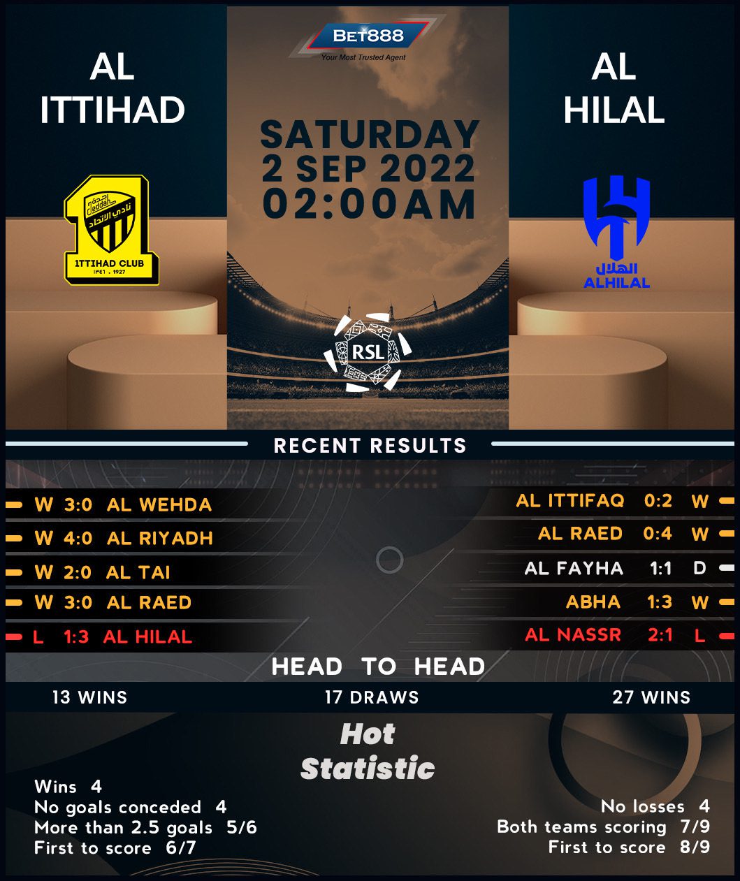 While this fixture will come too soon for Al-Hilal’s box-office signing Neymar, the visitors will turn to Aleksandar Mitrovic and Malcom to spearhead the attack. Hellbent on recovering domestic supremacy after surrending the title to Al-Ittihad last term, Jorge Jesus’ men have won all but one of their four opening Saudi Pro League outings (D1), including a clear-cut 2-0 home triumph over Al-Ettifaq last weekend. Delivering action from the onset, the visitors have got on the scoresheet before the interval in all four league matches this season, highlighting the potential for a quick-fire start. ‘Al-Za’eem’ can draw further confidence from replacing a two-game league start without a clean sheet with back-to-back shutouts. That’s particularly significant when considering they’ve capitulated on three of their last four Saudi Pro League visits to the Prince Abdullah al-Faisal Stadium.