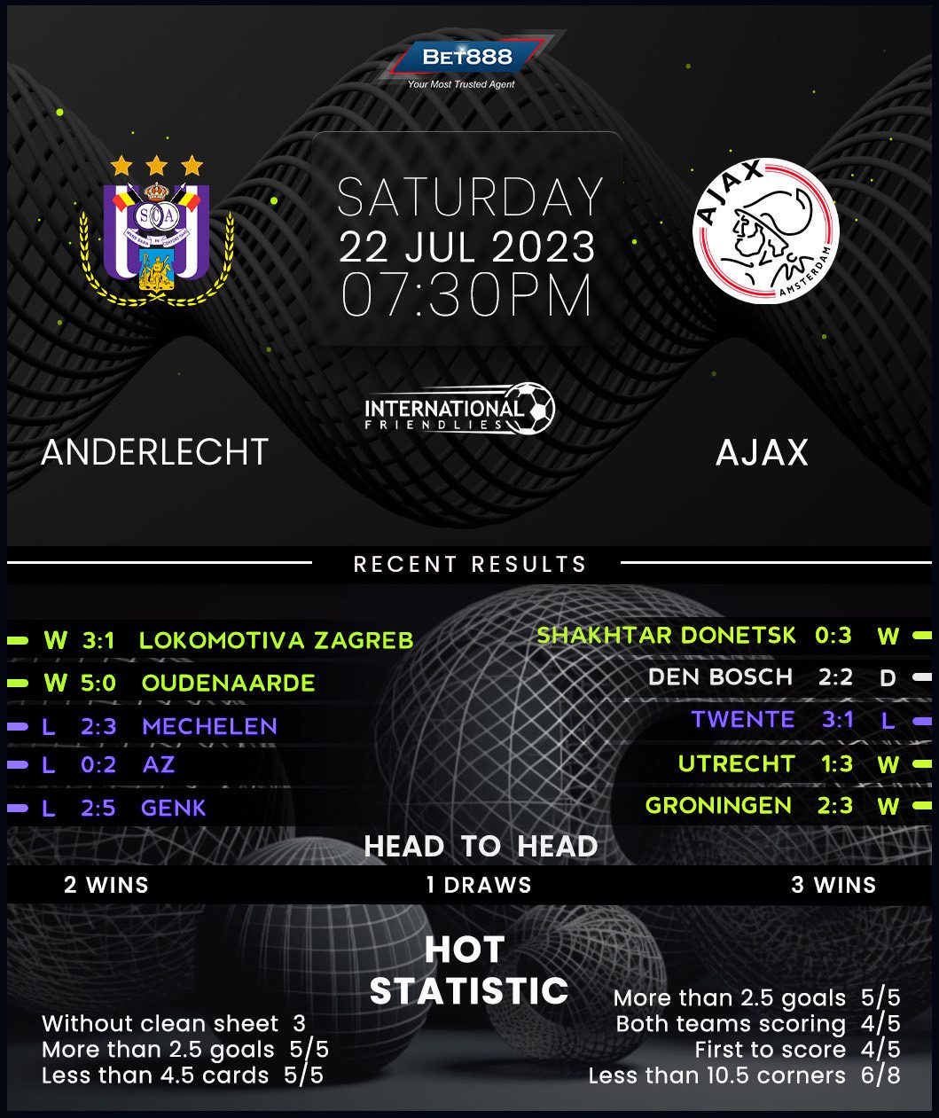 Last season couldn’t have gone much worse for the record-time Belgian champions Anderlecht as they had to settle for a humiliating 11th in the standings. Despite overseeing one of the club’s worst Belgian Pro League campaigns in modern history, under-fire manager Brian Riemer remains at the helm. A three-game winning streak fired Anderlecht’s pre-season to a flying start before an embarrassing 6-0 defeat to Sparta Prague last time out brought them back down to earth. Still, each of their four summer friendlies has featured 4+ total goals at an average of 5.5 per game, highlighting the potential for a high-scoring contest. Adding to this sentiment, three of their last five meetings with Ajax have produced over 2.5 goals.