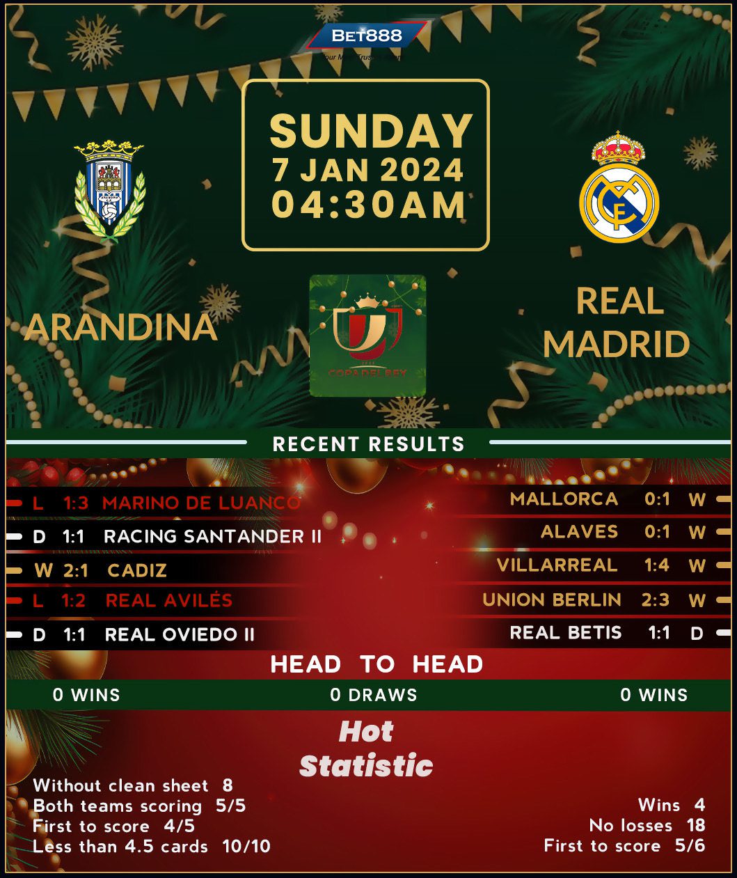 Stuck in the fifth tier of Spanish football, Arandina defied the odds to dispatch perennial top-flight tenants Cadiz 2-1 in the previous Copa del Rey round and set up this tie. But that unexpected triumph remains their only win across their last eight competitive outings (D2, L5), suggesting this should be the end of the road for Alex Izquierdo’s side. Without a clean sheet since a 1-0 triumph against Murcia in the second Copa del Rey round in early November, Arandina can at least hope to avoid a catastrophe after conceding multiple goals in only three of their eight matches during that dismal run.