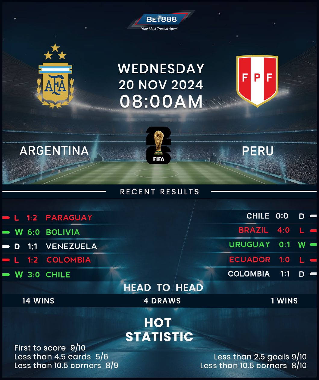 Keen to return to winning ways after a rare slip-up in the 2026 FIFA World Cup qualifying, Argentina host out-of-sorts Peru at the Estadio Monumental.