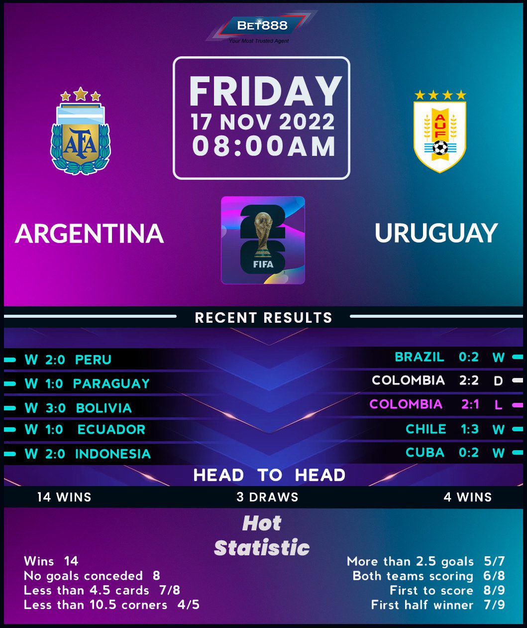 Reigning world champions Argentina come into the 198th edition of the famous Clásico del Río de la Plata in high spirits after winning each of their four 2026 World Cup qualifiers, looking to extend the gap in the 121-year history of this iconic fixture (W97, D52, L62). Lionel Messi’s first-half brace inspired ‘La Albiceleste’ to a 2-0 win at Peru last time out, cementing their place at the top of the CONMEBOL qualifying group as the only nation yet to concede a goal in the current cycle. With the nation’s confidence bursting at the seams after winning all eight internationals in the wake of their 2022 World Cup triumph, Lionel Scaloni’s men have set their sights on making it five World Cup qualifying victories on the trot for the first time in two decades.