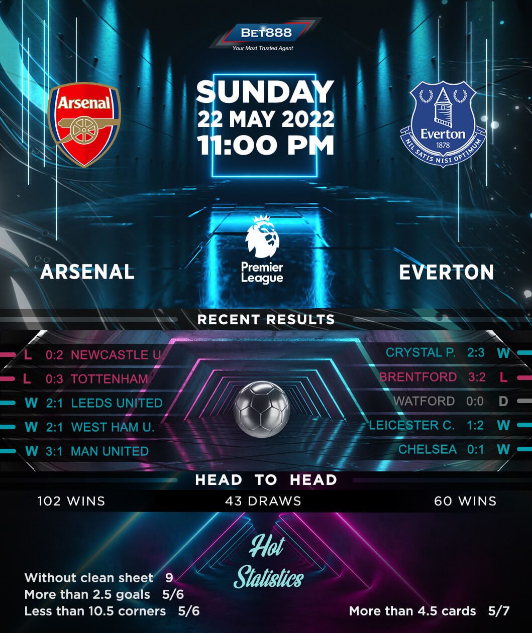 Arsenal are on the verge of missing out on a top-four Premier League finish for the sixth year running, following a run of consecutive defeats to Tottenham Hotspur and Newcastle United by an aggregate score of 5-0. Heading into the season finale, the ‘Gunners’ trail the fourth-placed ‘Spurs’ by two points and have to beat Everton and hope Antonio Conte’s men lose at already-relegated Norwich City to secure a fourth-place finish. There’s not much reason for optimism in the London camp, as Mikel Arteta’s men have lost their last three top-flight meetings with Everton and could lose four in a row for the first time since 1924. Conceding first could lead to another underwhelming result, with Arsenal losing 91% of their league matches in which they shipped the opener this term (W1, L10).