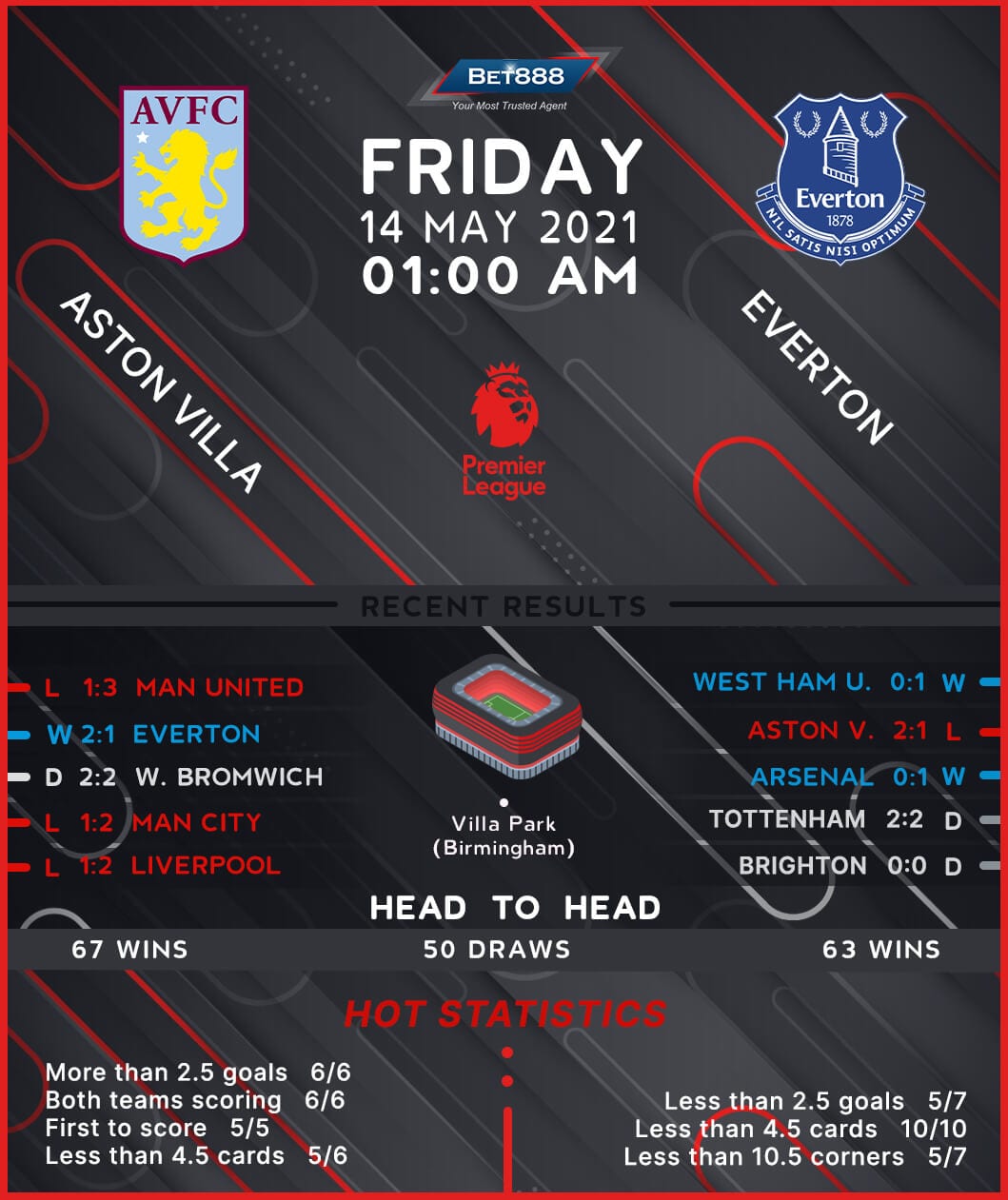 Aston Villa spurned a narrow half-time lead against Manchester United last time out to suffer a 3-1 defeat at Villa Park, their third reverse in the last five Premier League fixtures (W1, D1). Ahead of the kick-off, the ‘Lions’ have broken the deadlock in three consecutive home league matches without winning one (D1, L2). Indeed, Dean Smith’s men have wobbled at home in the Premier League lately, having picked up just a single victory across their last seven top-flight games on home turf (D2, L4). Additionally, the hosts have yet to taste win in a midweek Premier League game this term, having lost the last five on the spin since playing out a bore home draw with Burnley in December. A 2-1 triumph at Goodison Park in the reverse fixture back in January presents Villa with an opportunity to complete a league double over Everton for the first time since 2000/01.