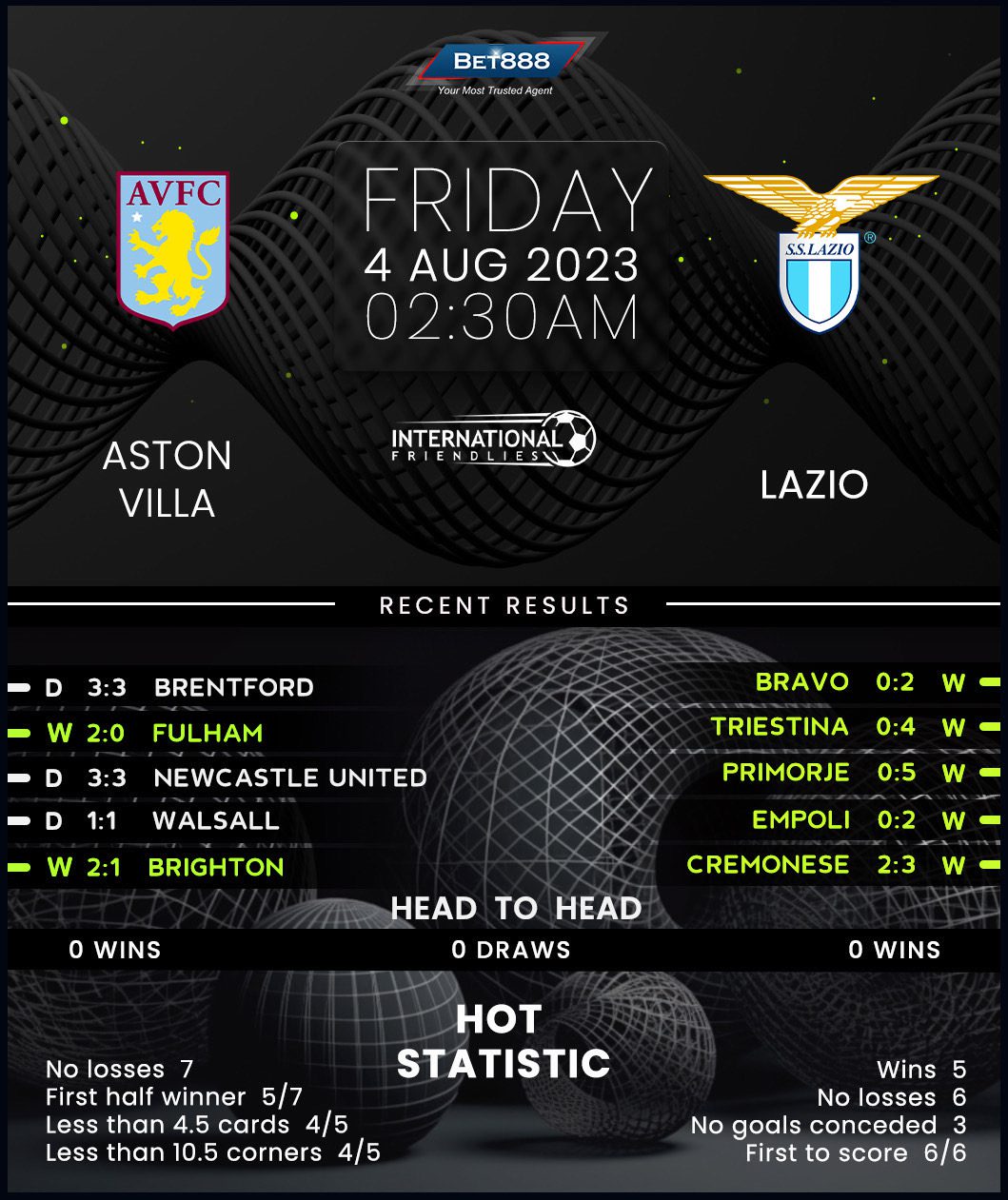 On the other hand, nominal visitors Lazio are well behind Villa in their preparations following an unexpected runner-up finish in the 2022/23 Serie A campaign. Maurizio Sarri’s men have been relentless across their opening two summer friendlies, dismantling Slovenian sides Primorje and Bravo by a combined score of 7-0. Both matches saw ‘I Biancocelesti’ open the scoring inside the opening half an hour and add to their tally beyond halftime. Those victories form part of Lazio’s decent-looking five-game winning streak, with four of those five wins seeing the Rome-based outfit keep a clean sheet. Equally impressive at the other side of the pitch, Sarri’s lads have netted 2+ goals in their last four games.