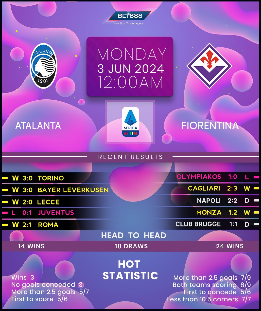 On the other hand, Fiorentina will end the season in eight, no matter the outcome. With four points separating them from seventh-placed Lazio, Vincenzo Italiano’s men can’t go up as they have to settle for another season in the Europa Conference League. Perhaps the third time could be the charm for ‘La Viola’ after Olympiacos’ extra-time winner condemned them to a second consecutive defeat in the Conference League title-deciding fixture. Bergamo is not an ideal place for the Tuscan outfit to find comfort after another European heartbreak. They’ve lost their last two competitive visits to Atalanta, including a disastrous 4-1 defeat in Coppa Italia action in April. Additionally, they’ve only won three matches on the road in 2024 (D4, L8).