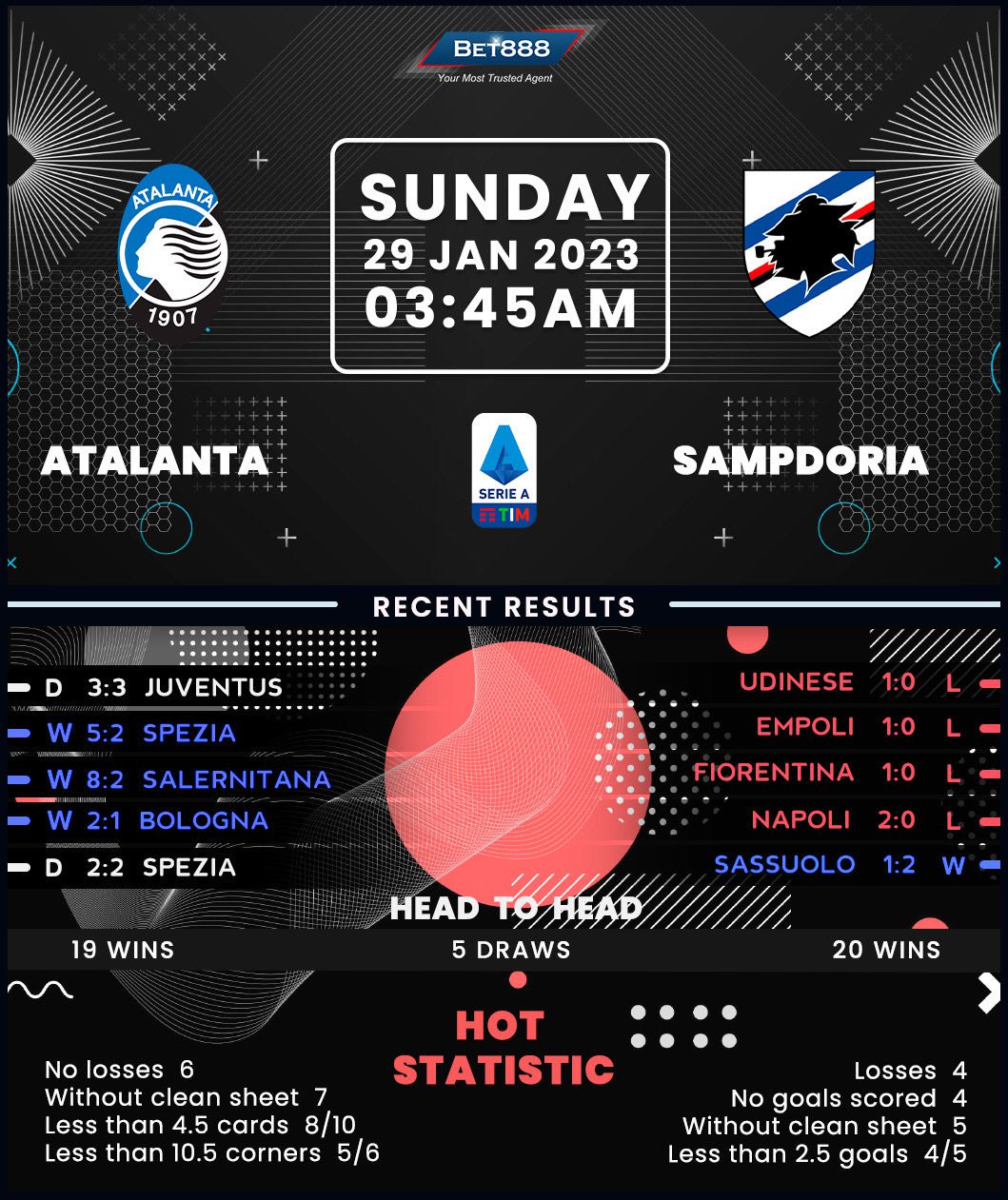 Meanwhile, Sampdoria opened their 2023 proceedings with a morale-boosting 2-1 win at fellow relegation rivals Sassuolo but have since slumped to four straight defeats in all competitions, failing to get on the scoresheet on each occasion. Left to pick up the slacks following a heartbreaking 1-0 home loss to Udinese last time out, under-fire manager Dejan Stankovic faces an uphill task of masterminding a turnaround, with Sampdoria already eight points off the survival pace. Indeed, the visitors have amassed only nine points at the halfway point of the season, accounting for their worst-ever points tally at this stage of Serie A campaign in their top-flight history. After losing three of their last four away league matches (W1), they have every reason for fearing for their prospects in Bergamo.