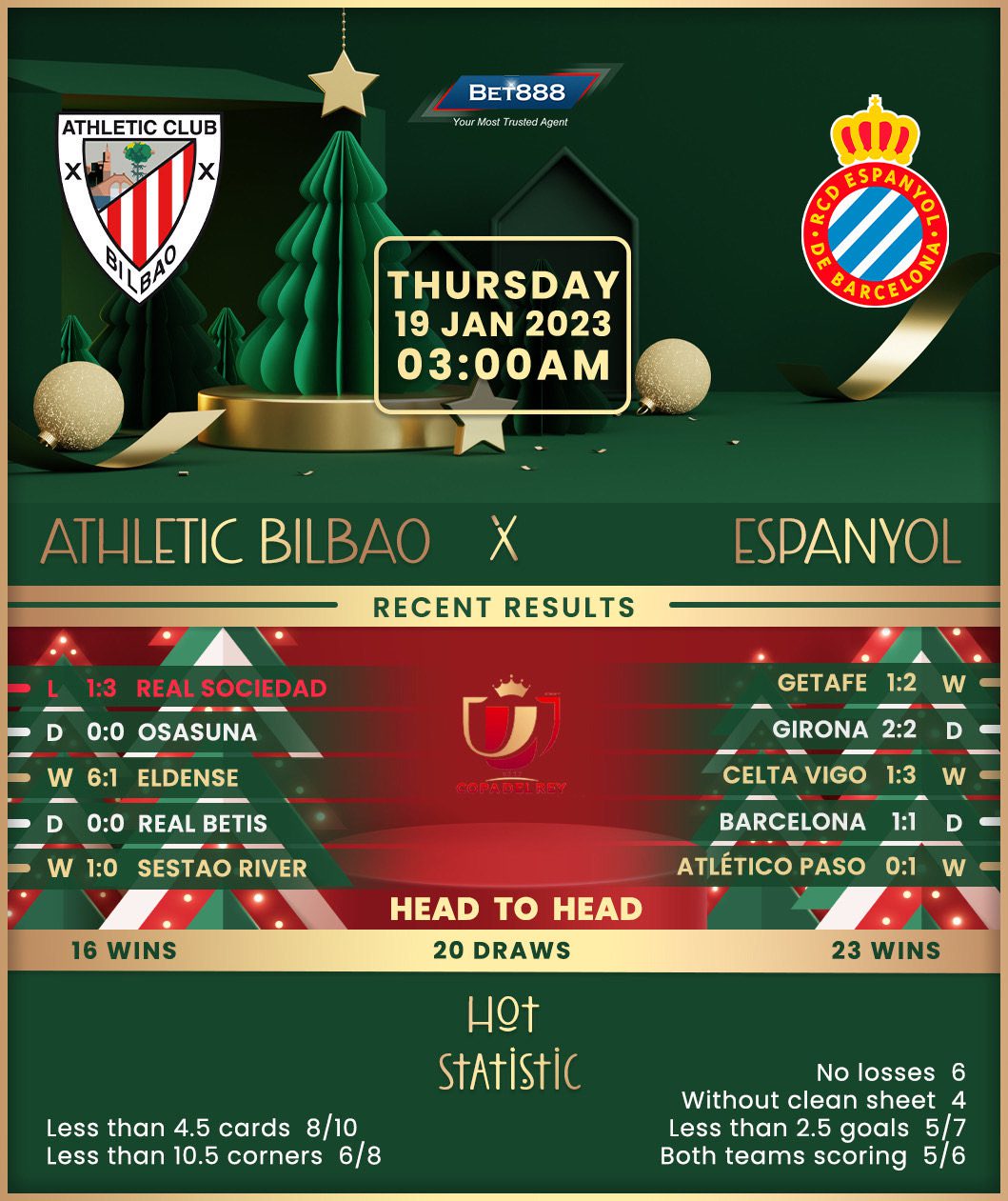 On the other hand, Espanyol’s Copa del Rey exploits are probably the only consolation for ‘Los Periquitos’ in an otherwise unpleasant 2022/23 season. After easing past a couple of lower-league sides in the opening two rounds, they ousted Celta Vigo last time out, courtesy of a 3-1 extra-time win to set up this tie. Diego Martinez’s men have built on that psychological impact, scoring precisely twice in two subsequent La Liga games (W1, D1), including a 2-1 victory at Getafe last weekend. That result marked Espanyol’s first away triumph against top-flight opposition since a 1-0 win at non-other than Bilbao in September, ending an underwhelming run of six winless road trips to meet La Liga clubs (D4, L2).