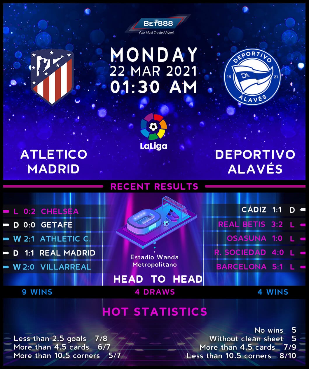After being ousted from the UEFA Champions League to Chelsea (0-1 H, 0-2 A), Atletico can channel their energy on La Liga, where they have not lost any of their last four matches (W2, D2). After winning eight consecutive league games at the Wanda Metropolitano, ‘Los Colchoneros’ have picked up just a single triumph in their last four encounters here (D2, L1), conceding over 1.5 goals on two of those occasions. Diego Simeone’s men have let in six goals in their last four home La Liga fixtures, three more than they managed in their previous ten in the competition. Notably, though, ‘Los Rojiblancos’ are unbeaten in their last 25 home league matches against Basque visitors (W20, D5) and have only lost once in their ten top-flight meetings with Alaves at this venue (W7, D2).