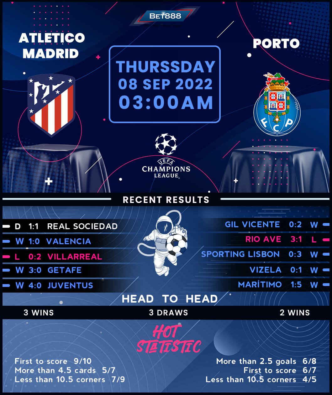 As for Porto, last season’s Primeira Liga success was no fluke, as Sergio Conceicao’s men have racked up four wins from five league fixtures this term (L1). Interestingly, this will be Porto’s 26th participation in the Champions League group stages, with only Barcelona and Real Madrid boasting more. After last season’s group phase exit, the ‘Dragons’ are keen to avoid back-to-back eliminations at this stage for the first time in the 21st century. Winning the opening game could be what the doctor ordered, yet they’ve gone winless in a curtain-raising Champions League contest across their last six appearances in the competition (D4, L2). Moreover, the Portuguese giants have managed just one win in their five previous UEFA-sanctioned visits to Atleti (D2, L2).