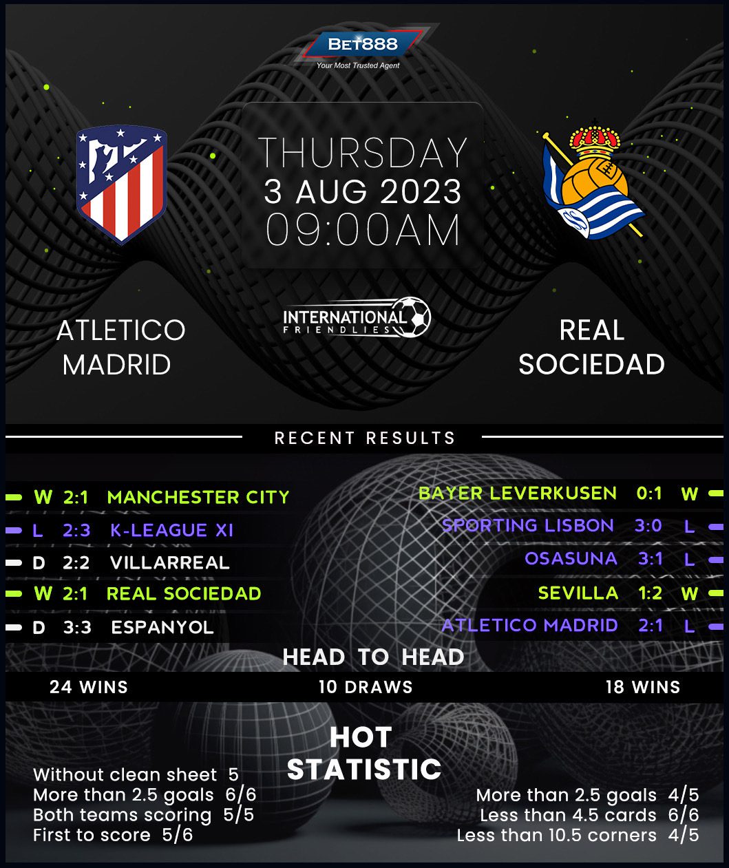 Atletico Madrid wasted two separate leads in a shock 3-2 loss to K-League Stars in their opening pre-season outing. But Diego Simeone’s side excelled when it mattered the most, scoring twice beyond halftime in a morale-boosting 2-1 win over Pep Guardiola’s all-conquering Manchester City side. Atletico’s vulnerability in the latter stages saw them concede beyond the 80th minute in both matches. Speaking of the Spaniards’ defensive woes, they’ve failed to keep a clean sheet in five consecutive games in the build-up to this fixture. However, each game in the sequence saw them bag 2+ goals, testifying to Atletico’s newly-discovered scoring prowess.