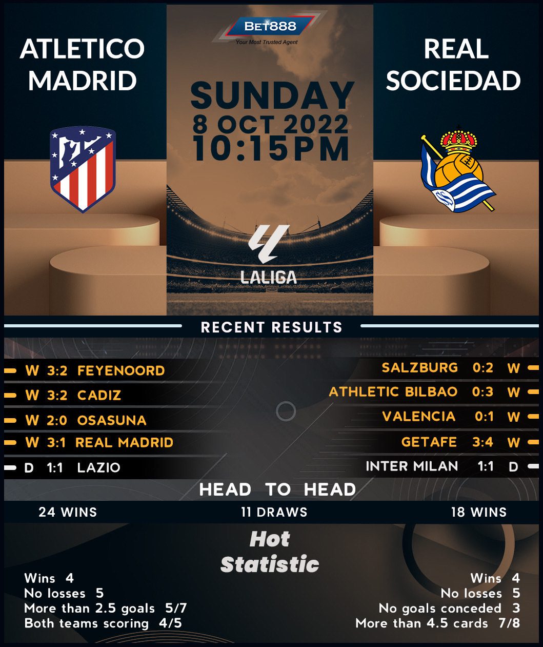 It’s been over a decade since Real Sociedad last conquered the Metropolitano Stadium, but manager Imanol Alguacil might feel this could be their chance to turn the corner. A 2-0 Champions League triumph at RB Salzburg in midweek stretched the visitors’ winning streak across all competitions to four matches. The last three of them have come ‘to nil,’ including an emphatic 3-0 win over bitter Basque rivals Athletic Bilbao in the previous La Liga round. Since a 2-1 loss at Real Madrid almost a month ago, ‘La Real’ have gone into overdrive, winning three successive league games via an aggregate score of 8-3. Delivering action from the get-go, Alguacil’s men have been in front at halftime in eight of their ten competitive matches in 2023/24, highlighting the potential for a quick start.