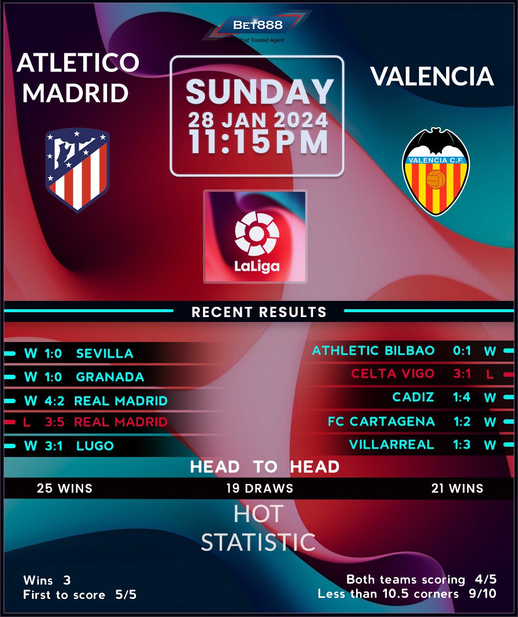 Atletico Madrid followed up a narrow 1-0 away league win against relegation-battling Granada with an identical Copa del Rey quarter-final triumph against Sevilla earlier this week, extending their winning streak in all competitions to three matches. Seeking back-to-back La Liga victories for the first time in 2024, ‘Los Colchoneros’ will be out to avenge an embarrassing 3-0 defeat in the reverse fixture and protect their incredible 14-game unbeaten run against Valencia in the Spanish capital (W10, D4). Long-serving manager Diego Simeone will expect nothing less after his charges picked up 28 out of the 30 available points at the Metropolitano Stadium this season (W9, D1). But with two of their last three home league wins yielding a narrow 1-0 scoreline, there could be plenty of drama in this contest.