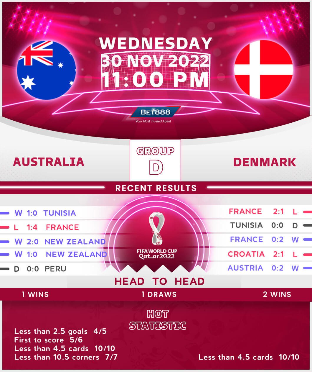 Unfazed by a thumping 4-1 defeat at the hands of reigning world champions France on the opening matchday, Australia recorded their first World Cup finals victory last time out, courtesy of a narrow 1-0 win over Tunisia. A draw will likely do the trick for the ‘Socceroos‘ as they bid to qualify for the competition’s knockout rounds for the first time since 2006. However, facing a European nation could throw a spanner in the works, with the Australians suffering eight defeats across 11 World Cup encounters against teams from the UEFA confederation (W1, D2) without keeping a clean sheet. On top of that, Graham Arnold’s men have picked up just three triumphs in 18 World Cup games (D4, L11), all of which arrived against sides ranked well below Denmark in the FIFA world rankings.