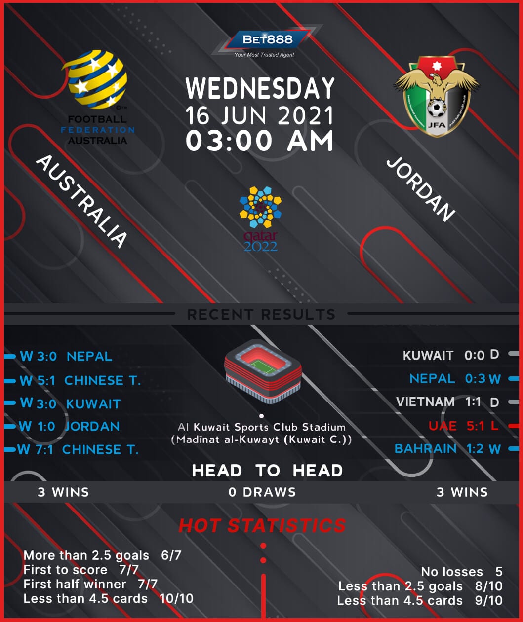 Australia and Jordan will lock horns at the Al Kuwait Sports Club Stadium as the visitors look to improve their chances of reaching the third stage of the 2022 World Cup qualifying campaign.