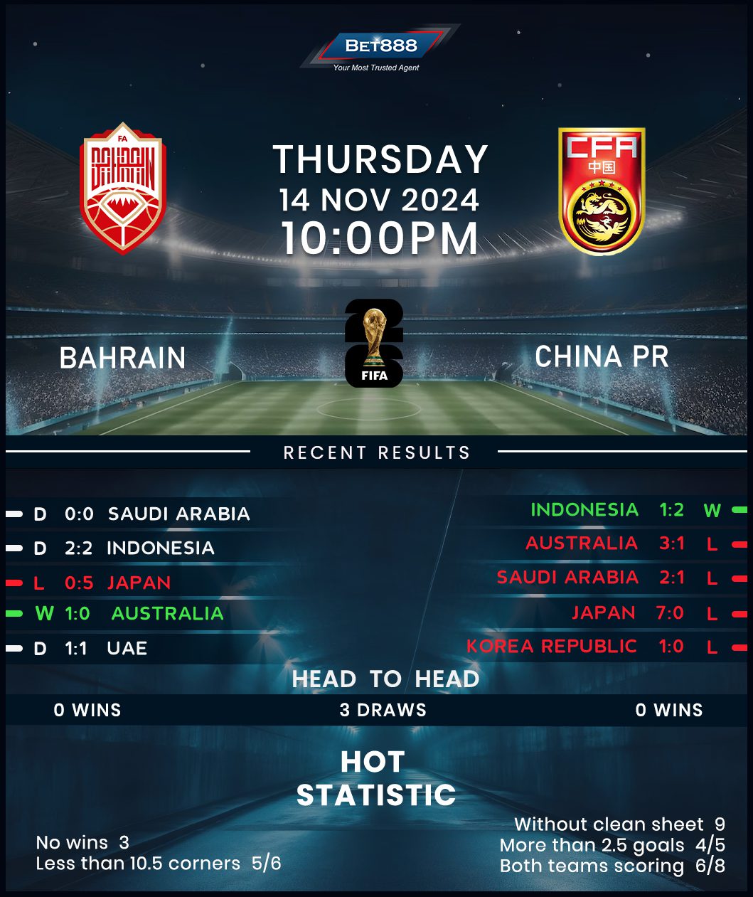 Despite its financial power and diversified economy, China has never been a footballing nation, as evidenced by just a single World Cup appearance back in 2002. Not long ago, they seemed destined for another qualifying fiasco before a morale-boosting 2-1 home triumph against Indonesia last time out halted their disastrous three-game losing start to Group C. However, Branko Ivankovic’s men have traveled poorly in the ongoing qualifying campaign, losing both away fixtures to Japan and Australia by a combined score of 10-1! Another disappointment would likely end their hopes of pulling off a late comeback after whittling down the gap on second-placed Australia to only two points.