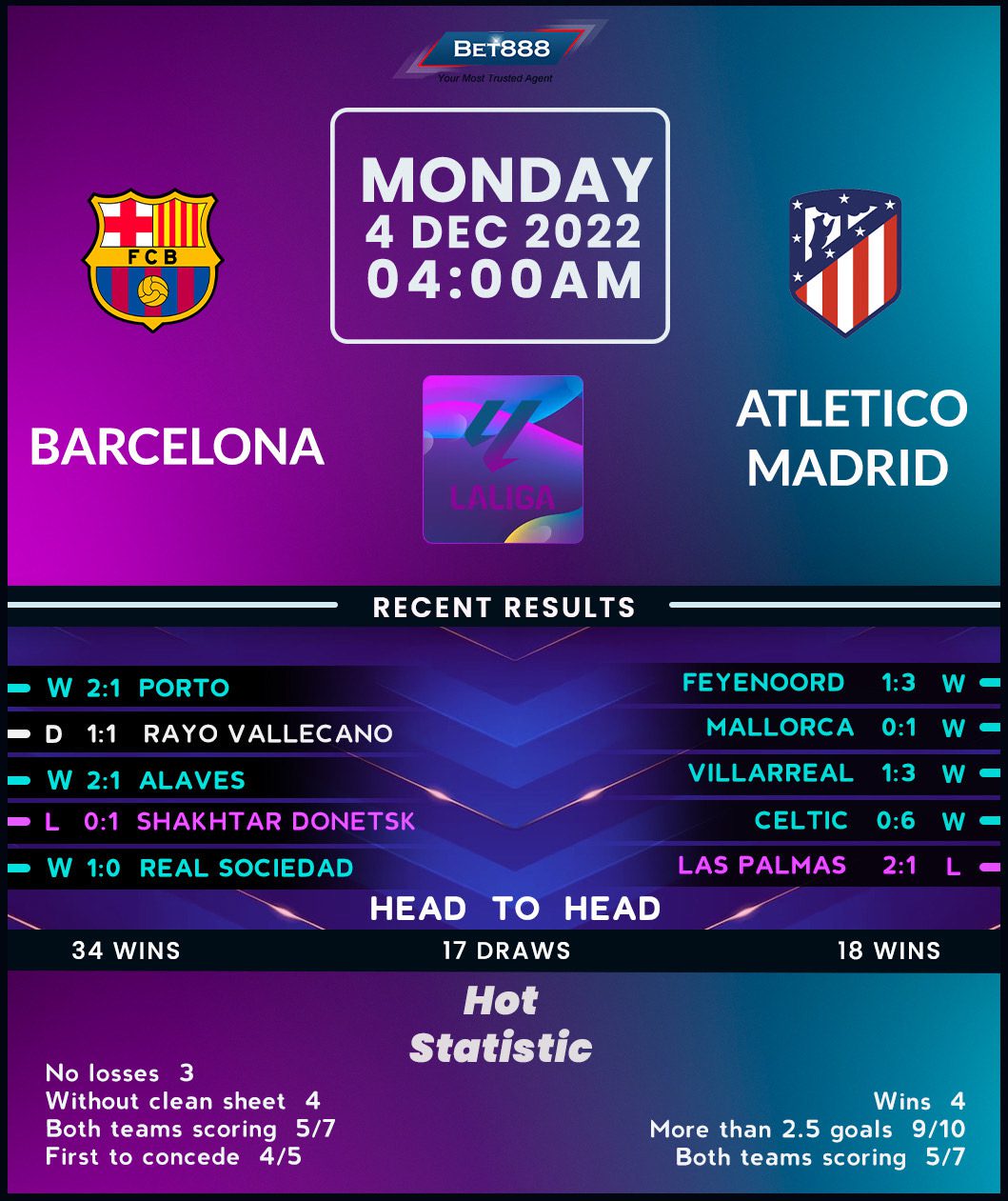 If there’s a side capable of following in Real Madrid’s footsteps, it’s Atletico Madrid. Diego Simeone’s high-flying team takes this trip amid a four-game winning streak in all competitions, bookended by a 3-1 battering of Feyenoord in midweek Champions League action. Despite sitting level on points with Barcelona ahead of the kick-off, ‘Los Colchoneros’ should approach this game with cautious optimism as they slumped to a shocking 2-1 defeat to Las Palmas on their last La Liga travel, not to mention they’re without a top-flight win in Catalonia since 2006. Since that success, they’ve gone winless in 23 consecutive away H2Hs against Barcelona (D8, L15). But this fixture won’t take place at Camp Nou (like those 23), handing Atletico a glimmer of hope that they could arrest a three-game losing H2H run.