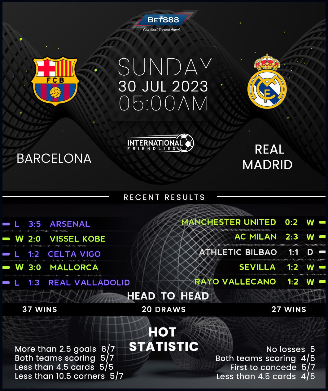 More than just bragging rights are on the cards here, especially after Barcelona dethroned Real Madrid in La Liga last season. Both sides won one league ‘El Clasico’ apiece in 2022/23, but ‘Los Merengues’ thrashed the Catalan powerhouse 4-1 on aggregate in the Copa del Rey semi-finals en route to lifting the title. Carlo Ancelotti’s men have been impressive in the United States thus far. After overhauling a 2-0 halftime deficit to beat AC Milan 3-2 in their first friendly in the States, ‘Los Merengues’ scored on either side of halftime in a comfortable 2-0 win over Manchester United. Those triumphs form part of Madrid’s five-match unbeaten run (W4, D1), suggesting they’ll take the field in high spirits.