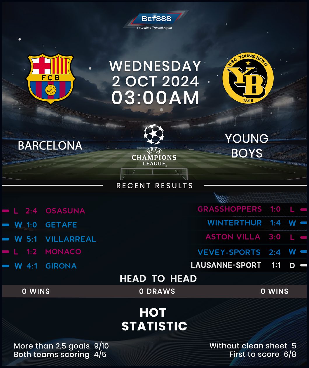 Hansi Flick’s honeymoon period in charge of Barcelona suffered a catastrophic end last weekend as Osasuna thrashed his experimental line-up 4-2, knocking them down from a 100% La Liga start (W7). After taking ‘full’ responsibility for his side’s slump at El Sadar, Flick will be keen to atone against Young Boys, especially after his 10-man side lost 2-1 at Monaco in the opening Champions League round. That was Barcelona’s fourth defeat across their last eight outings at Europe’s top table (W3, D1) and a third in a row to see them concede at least two goals. Therefore, anything other than three points against the Swiss outfit could prove detrimental to Barca’s quest to secure automatic knockout qualification. Los Blaugranas infamously succumbed to a 4-2 defeat to PSG in their last home outing in the Champions League, relinquishing a four-match winning streak on this ground beforehand.