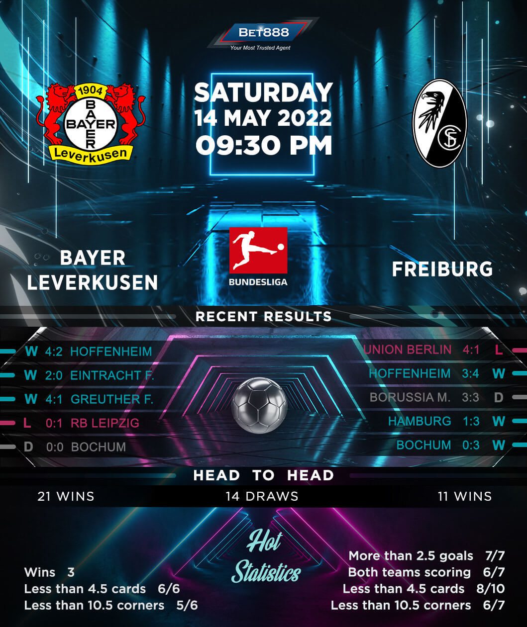 In the meantime, Freiburg’s indifferent three-match Bundesliga form (W1, D1, L1) could cost them dearly, as they need to pick up all three points here and hope RB Leipzig to go down at Arminia Bielefeld to secure a coveted fourth-place finish. A victory at the BayArena is not beyond the realm of possibility, though, with ‘Breisgau-Brasilianer’ going unbeaten in their last seven competitive away games against domestic rivals (W4, D3), including three wins in a row in the build-up to this trip. Moreover, Freiburg recorded a 2-1 victory in their most recent league visit to Leverkusen, ending an abysmal streak of seven away H2H Bundesliga clashes without winning (D2, L5). With Freiburg’s last three top-flight matches featuring 5+ goals and both teams on the scoresheet, this could be an action-packed contest.