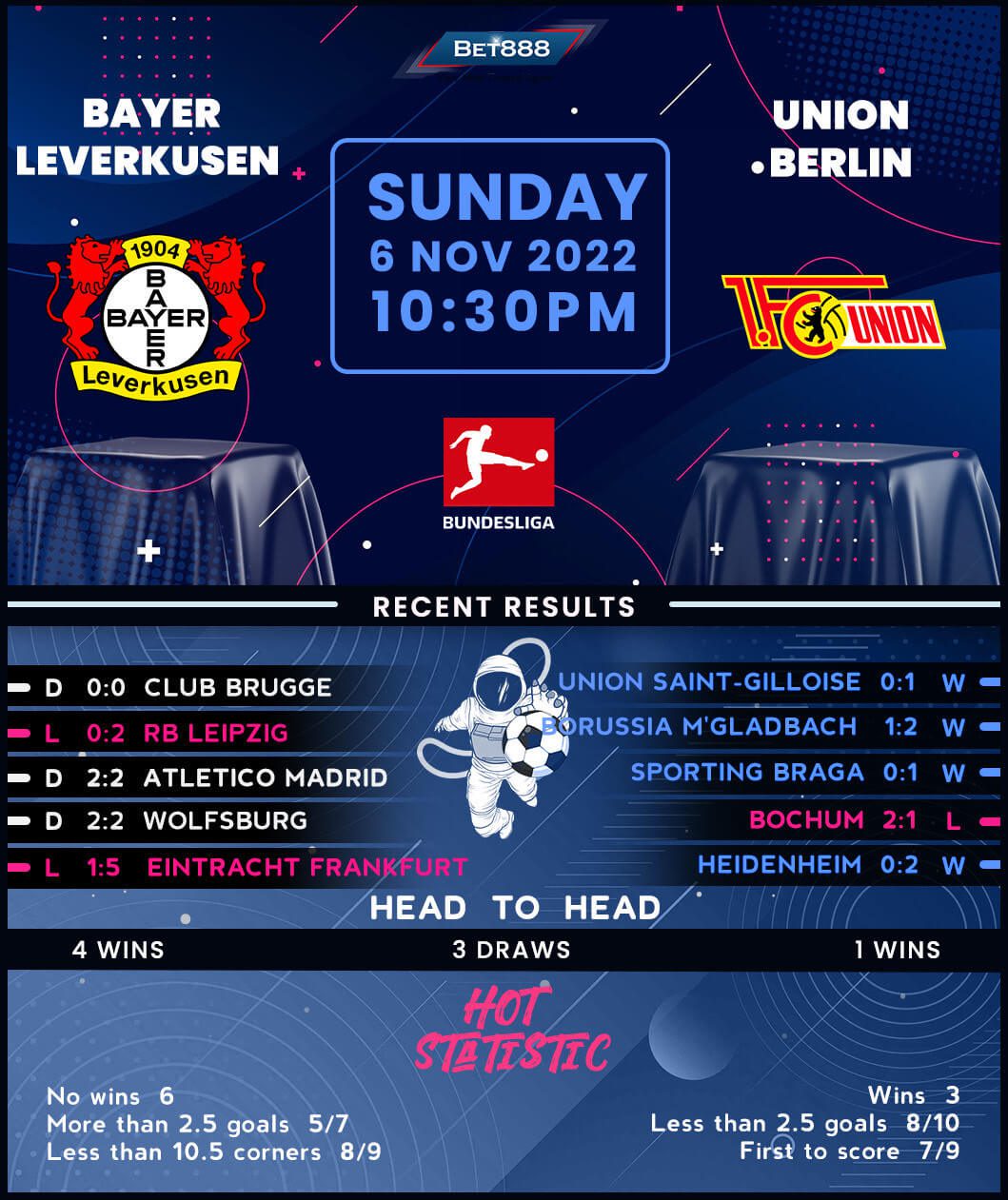 Unlike their hosts, Union Berlin head into proceedings in high spirits after a hard-fought 1-0 win at Royale Union SG in midweek Europa League action captured their place in the competition’s knockouts. A 2-1 defeat at early relegation candidates Bochum on their latest Bundesliga travel sparked doubts over their ability to maintain a stellar top-flight start (W8, D2, L2), yet ‘Die Eisernen’ silenced their critics last weekend. Despite finding themselves 1-0 down at halftime, Berlin pulled off a stunning late comeback to beat Borussia Monchengladbach 2-1 and re-establish control at the summit. But with Berlin’s last four away league games fluctuating between wins (2) and losses (2), it’s hard to predict which version of Urs Fischer’s side Leverkusen will take on.