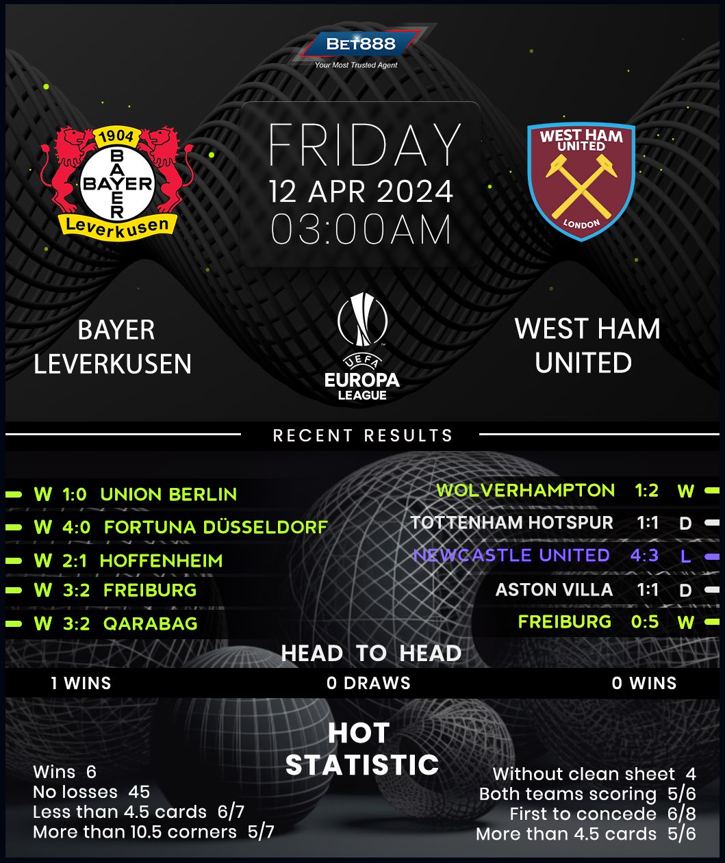 Meanwhile, West Ham brought their topsy-turvy Premier League campaign back on track last weekend, coming from behind to beat Wolverhampton 2-0 to end a four-game winless league run (D3, L1). David Moyes’ side also needed a comeback to set up this tie, overturning a 1-0 first-leg deficit against Leverkusen’s domestic rivals Freiburg in the previous round with an overwhelming 5-0 home triumph. Despite staring at long odds, Moyes will not shy away from the challenge after winning both managerial encounters against Leverkusen. But that record is in jeopardy, especially as the Hammers have lost two of their last three away European games against German opposition (W1). The visitors have been notoriously inconsistent on their recent Europa League travels, alternating between victories and defeats in their last eight away matches (W4, L4).
