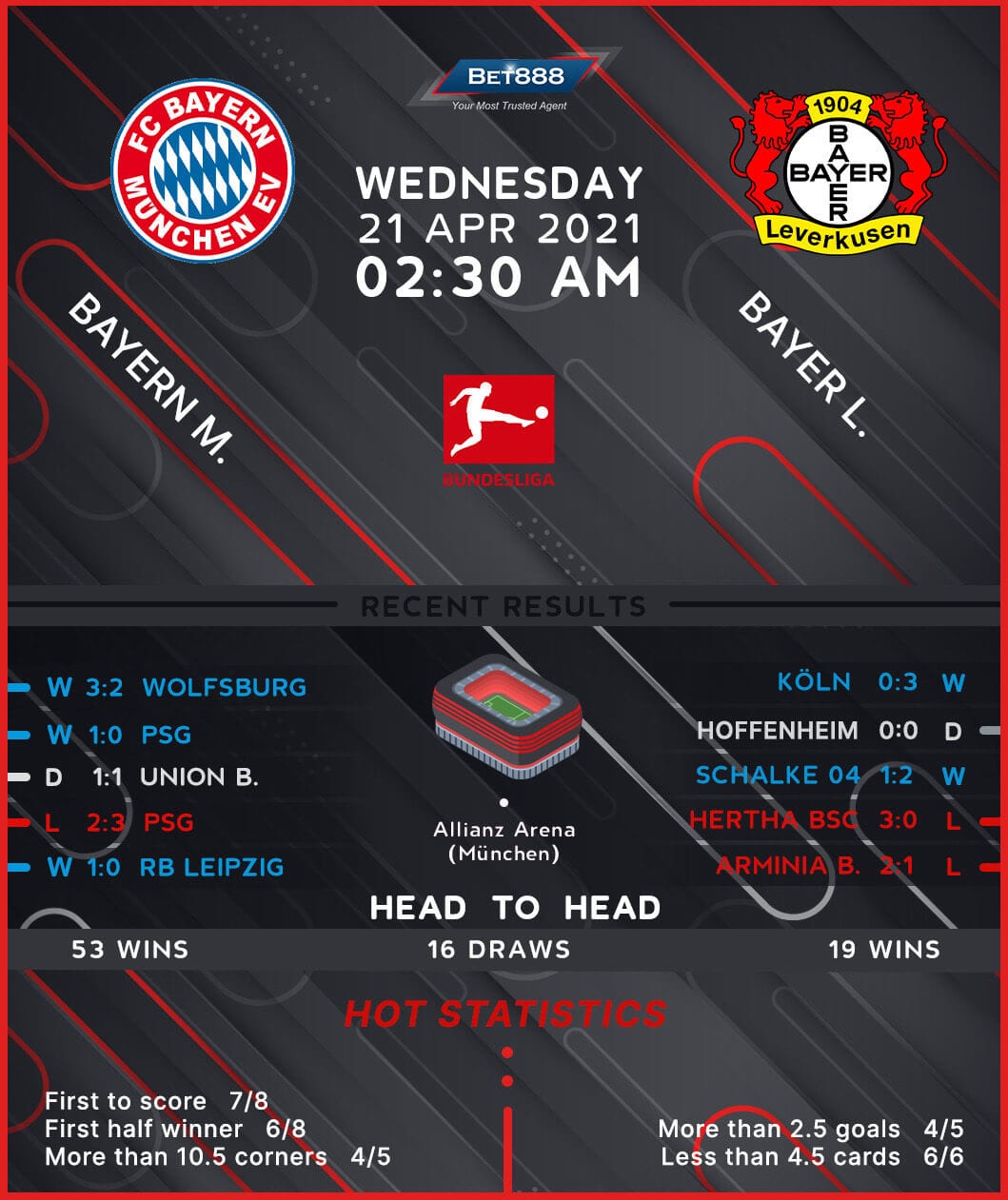 Meanwhile, Leverkusen’s 3-0 home triumph over Koln last time out saw them extend their unbeaten Bundesliga run to three games (W2, D1), having suffered back-to-back defeats beforehand. After keeping two consecutive Bundesliga clean sheets, ‘Die Werkself’ can now register three league shutouts in a row for the first time since 2016. The ‘clean-sheet’ theme has highlighted Bayer’s recent away Bundesliga matches as each of the last three has seen one or both sides fail to get on the scoresheet, with two of them featuring under 1.5 total goals (W1, D1, L1). By contrast, each of their last four top-flight trips to Bayern Munich has seen both teams score in fixtures garnering over 2.5 total goals. Curiously, the visitors have yet to taste defeat in the Bundesliga under interim manager Hannes Wolf (W2, D1).