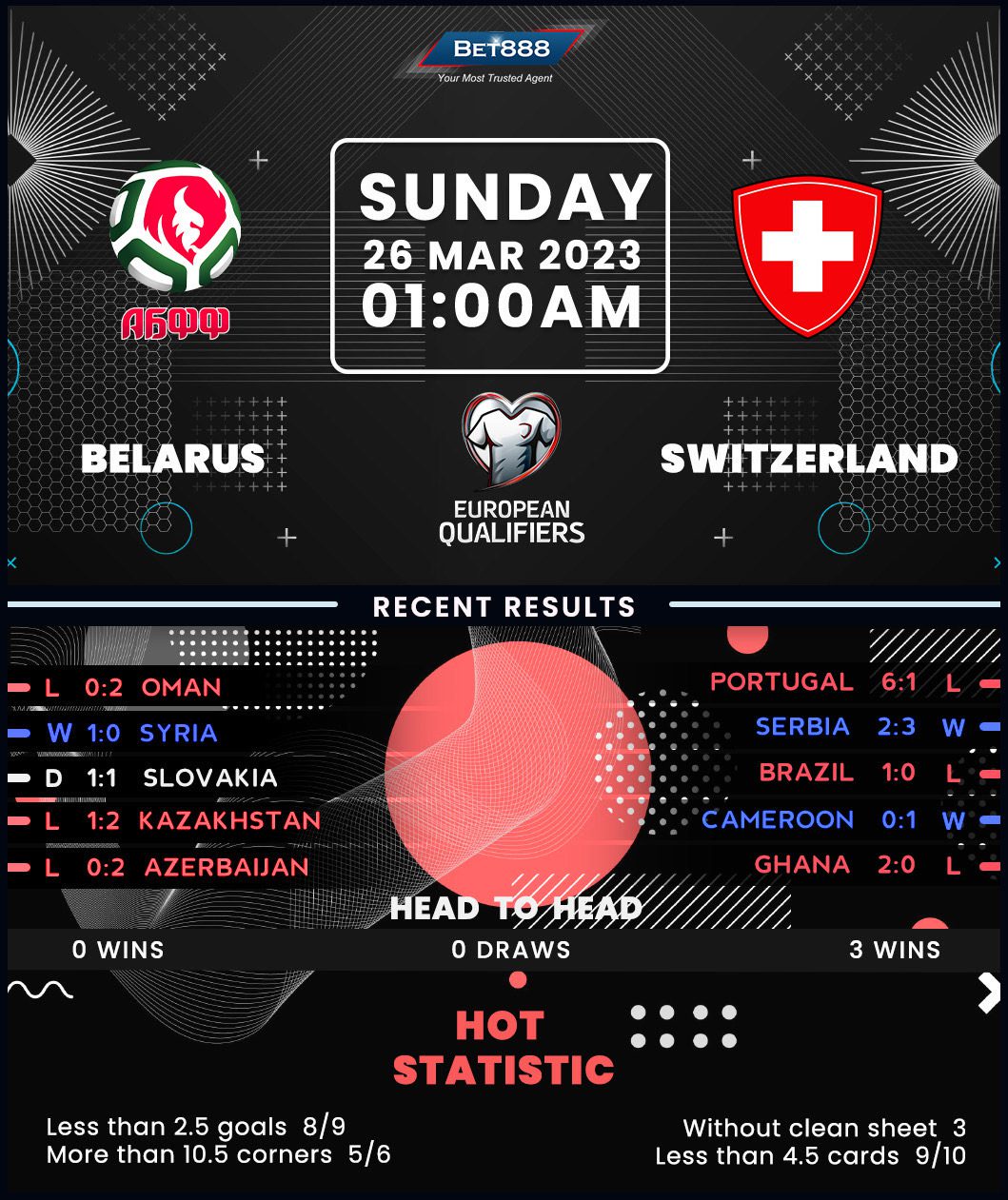 It’s been over 20 years since Belarus last qualified for a major international tournament, most recently reaching the 2002 World Cup. Yet to secure a European Championship appearance as an independent nation, the hosts will be desperate for a strong start after an underwhelming run of form in their last eight matches down the tail-end of 2022 (W1, D3, L4). Unfortunately for the ‘White Wings,’ Russia’s invasion of Ukraine has forced them to play home games in Serbia, derailing their faint hopes of capturing a first competitive triumph since March 2021. Indeed, they’ve suffered ten defeats in their last 13 matches in all competitions (D3). Another disappointment is well on the cards, considering they’ve lost both previous competitive meetings with Switzerland without scoring. The last time they met, the Swiss ran out 1-0 victors in an international friendly in 2017.