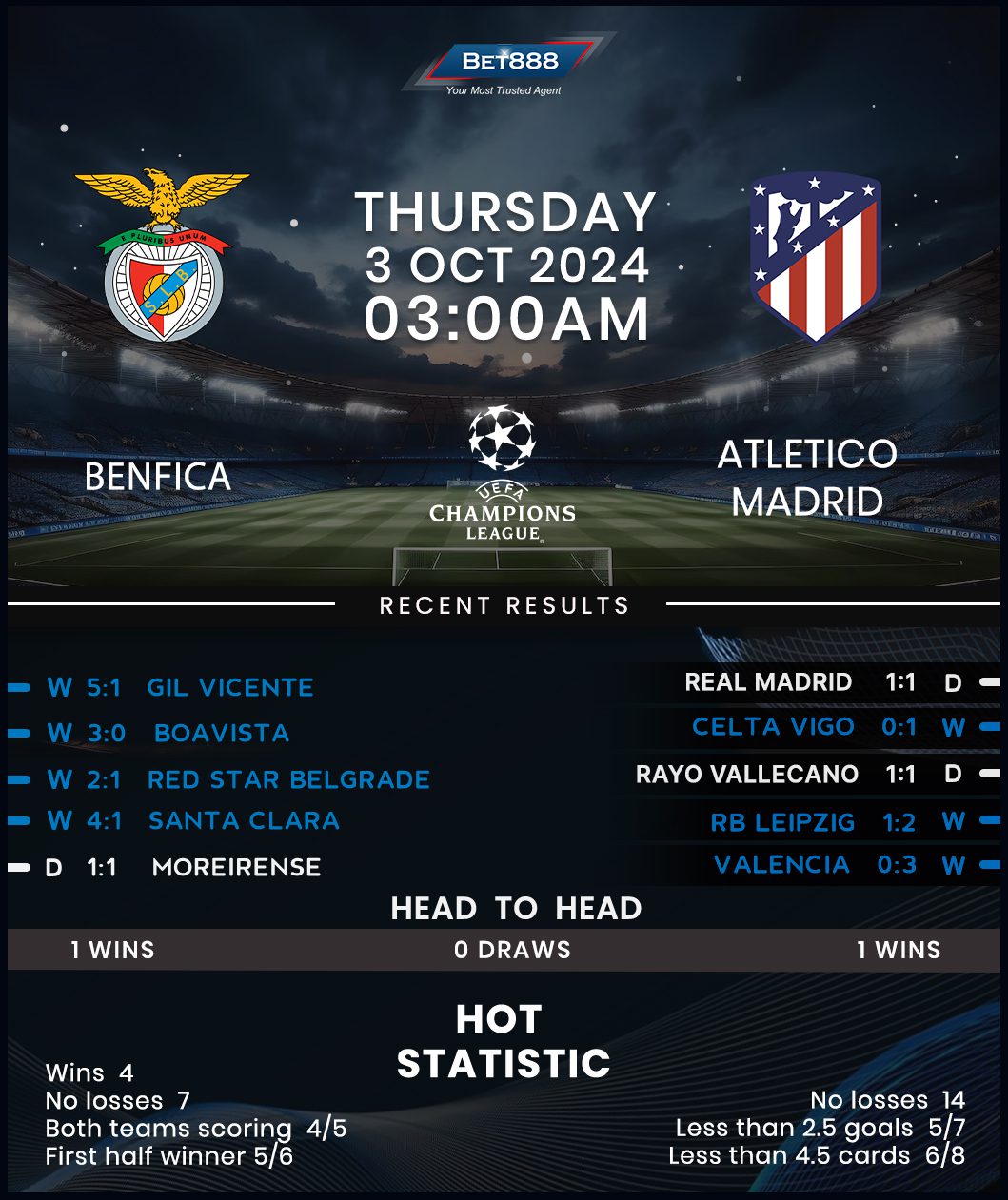 In the meantime, Atletico Madrid bagged a late equalizer in a dramatic 1-1 home draw against bitter rivals Real Madrid last weekend, maintaining their unbeaten run in 2024/25 (W5, D4). Diego Simeone’s side bounced back from an early deficit to beat RB Leipzig 2-1 in their Champions League opener, netting a 90th-minute winner. However, that victory came in Madrid, while Los Colchoneros’ recent away record in Europe’s elite club competition cannot inspire much confidence. They’ve registered just one victory on their last nine Champions League travels (D2, L6), casting doubt on their hopes of extending their undefeated start to the season. On the bright side, they’ve fared well in Portugal lately, claiming three wins on their last four visits to the country (L1).