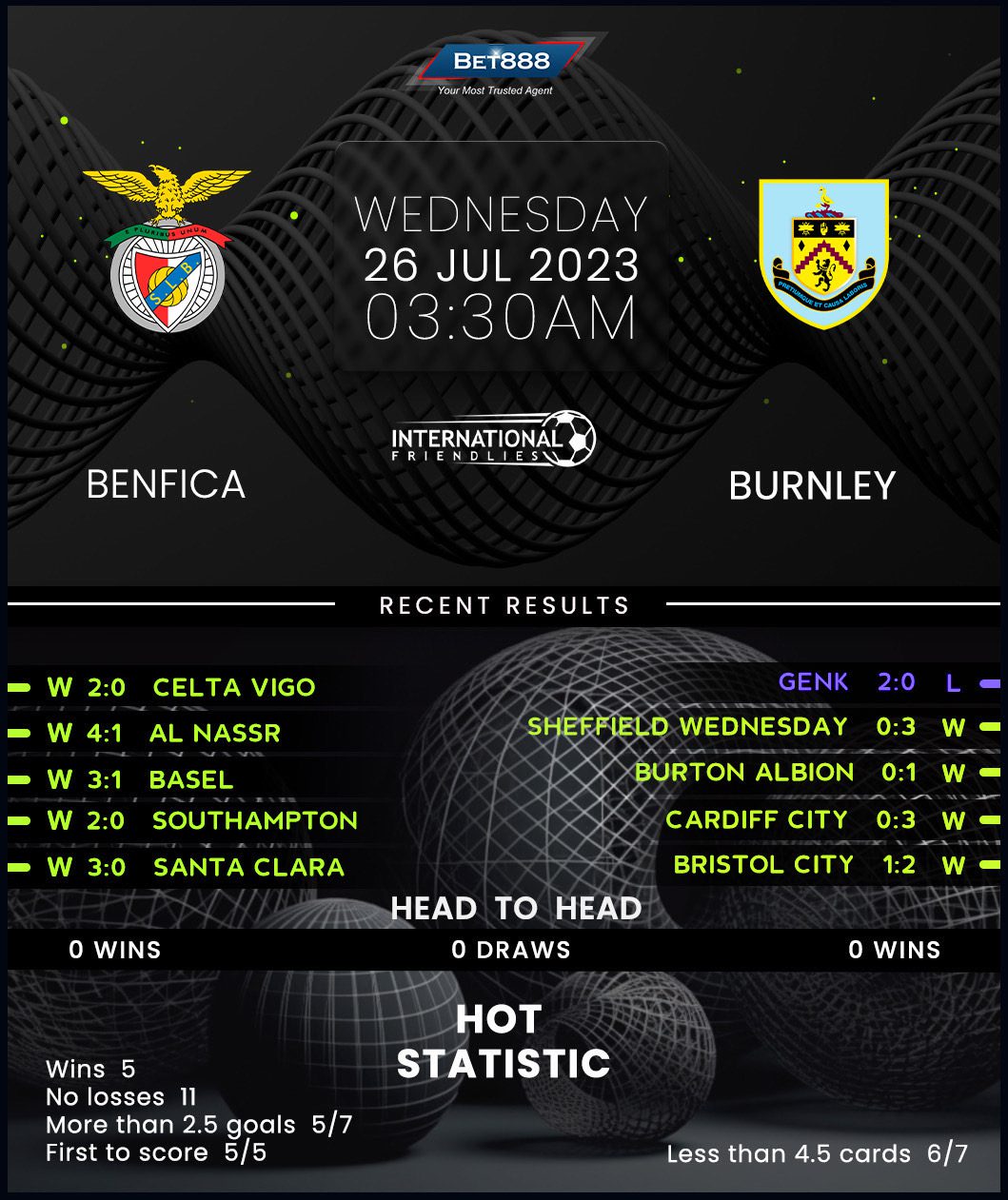 Benfica and Burnley are set to face off against each other at the Estádio do Restelo in their first-ever encounter.