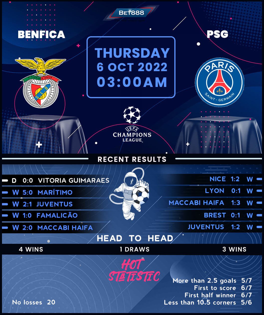 On the other hand, visiting Paris Saint-Germain claimed a hard-earned 2-1 home triumph over fellow Ligue 1 rivals Nice at the weekend, maintaining an eye-catching 12-game unbeaten 2022/23 start (W11, D1). Keen to lift their first-ever Champions League crown, ‘Les Parisiens’ have won both Group H fixtures despite conceding in the first half on each occasion. After a 3-1 victory in Haifa last time out ended PSG’s underwhelming five-game winless Champions League streak on the road, Christophe Galtier’s men will be out to restore parity in the overall H2H stakes against Benfica (W2, D1, L3). Motivation won’t be lacking as Galiter could become only the second PSG manager to win his first three Champions League games in charge of the joint-record French champions.