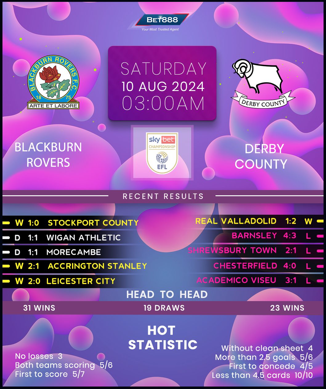 Blackburn Rovers barely kept hold of their Championship status last term, finishing 19th out of 24. Despite a torrid campaign, the Rovers have decided to stick with manager John Eustace, who arrived at the club in February. Blackburn notoriously struggled for consistency toward the end of 2023/24, with their last nine league matches alternating between different outcomes (W3, D3, L3). But seven of those nine games saw one or both teams fail to get on the scoresheet, suggesting whoever opens the scoring in this fixture would likely take three points. Despite their underwhelming 2023/24 campaign, the Riversiders head into proceedings in a buoyant mood, having defeated Derby in six of their last seven league meetings (L1), including a thumping 3-1 win in this corresponding fixture in March 2022.