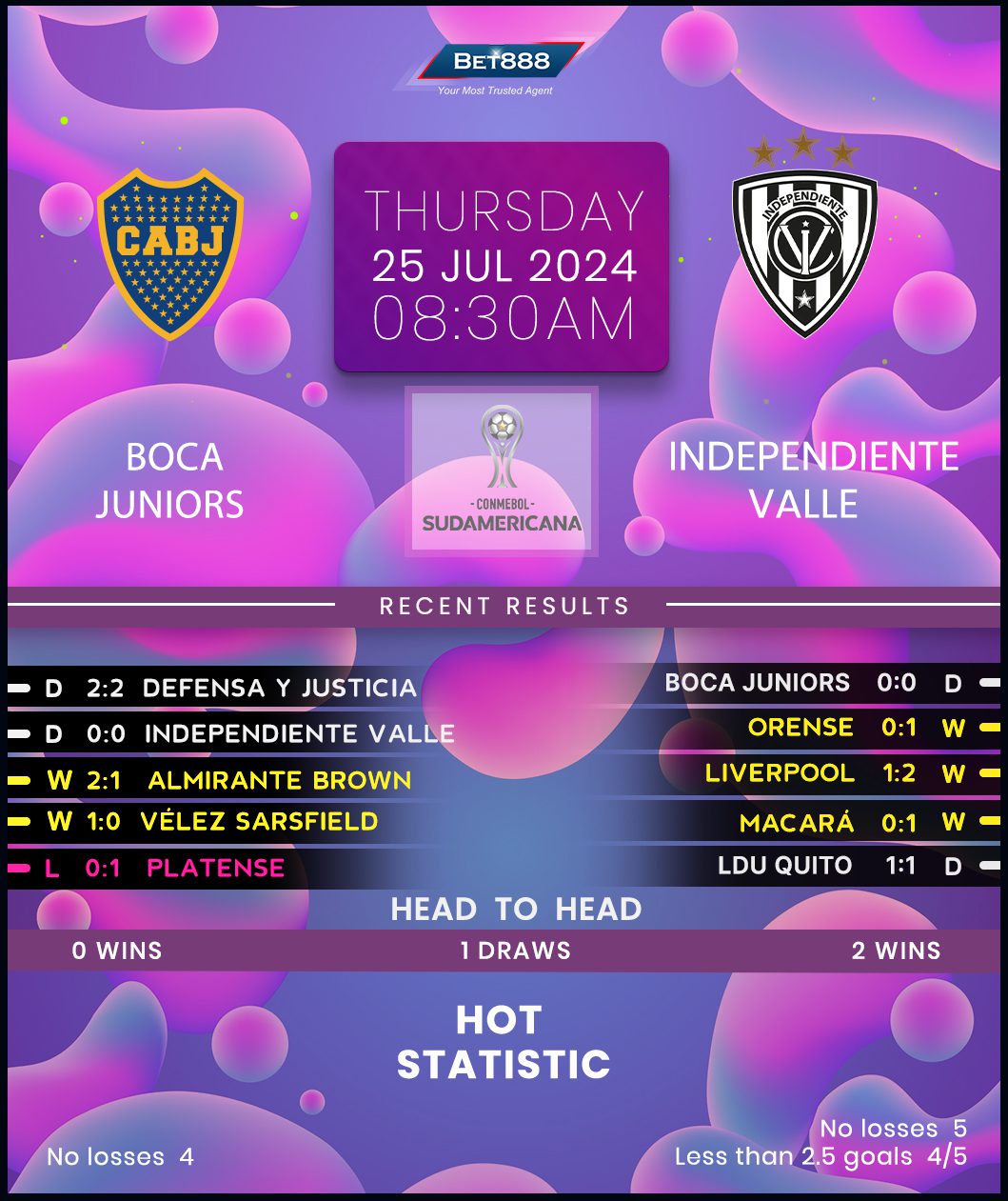 Though things are not going Boca Juniors’ way at the beginning of the new Liga Professional season (W2, D2, L2), the Argentine heavyweights could still make amends on the continental front. Following a tepid 0-0 draw in the reverse fixture, Diego Martinez’s side can turn to their raucous home atmosphere to help them reach the Copa Sudamericana quarter-finals and maintain their dream of winning the tournament for the first time since 2008. Unbeaten in four matches in the build-up to this pivotal clash (W2, D2), Boca Juniors ought to be confident about pulling off their first-ever win against Independiente del Valle after three failed attempts (D1, L2). Three consecutive home wins by an aggregate score of 7-1 can only solidify the hosts’ morale.