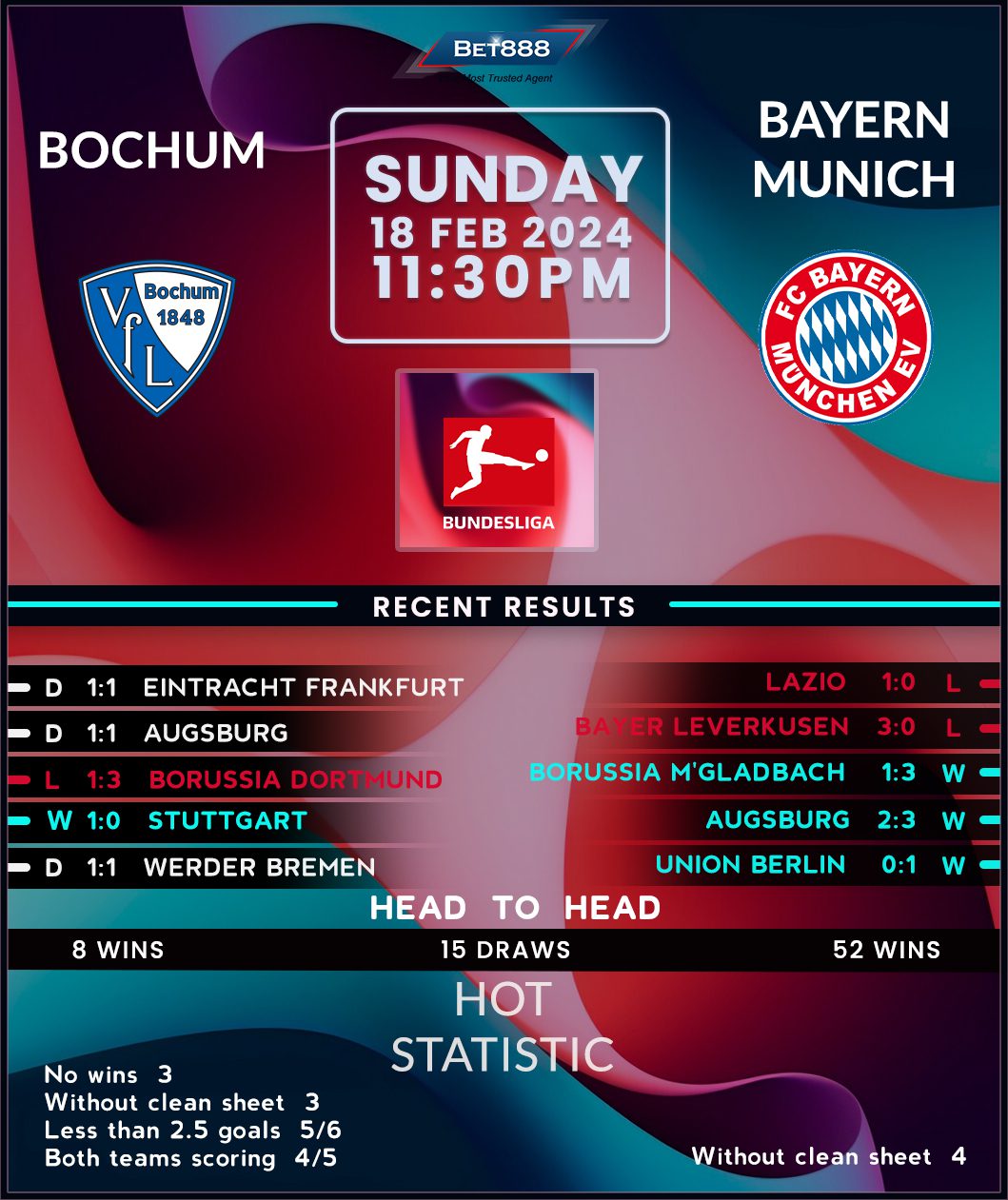 Despite suffering just seven Bundesliga defeats, their lowest number of losses since securing a fifth-place finish in 2003/04, Bochum’s proclivities for sharing the spoils have contributed to their 14th place in the standings. Having drawn a league-high ten matches this term, including the last two on the trot, the hosts commence this round only six points clear of the bottom three. But Thomas Letsch’s side would probably sign up for another stalemate in this match-up, knowing they’ve lost their last three league encounters against Bayern by a combined score of 17-0, including a 7-0 romping in the reverse fixture. On a more positive note, ‘Die Unabsteigbaren’ are unbeaten in home league action since October (W3, D4), scoring precisely once in all three such contests in 2024 (W1, D2).
