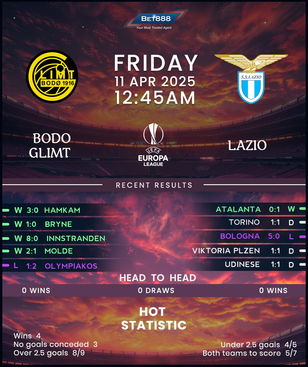 Visiting Lazio must defy Bodo/Glimt’s eye-catching record of eight victories from their last nine continental games on home turf (L1) to return home with a favorable result. ‘I Biancocelesti’ squeaked past Viktoria Plzen 3-2 on aggregate to set up their first European quarter-final since 2018 – their sixth overall last-eight appearance in this competition. However, they’ve lost their last two away matches at this stage of the Europa League, contributing to their negative quarter-final record (W2, L3). Nonetheless, Marco Baroni’s men take this trip in good spirits after only losing once in their last seven outings across all competitions (W3, D3), including three victories from their four most recent road matches (L1).