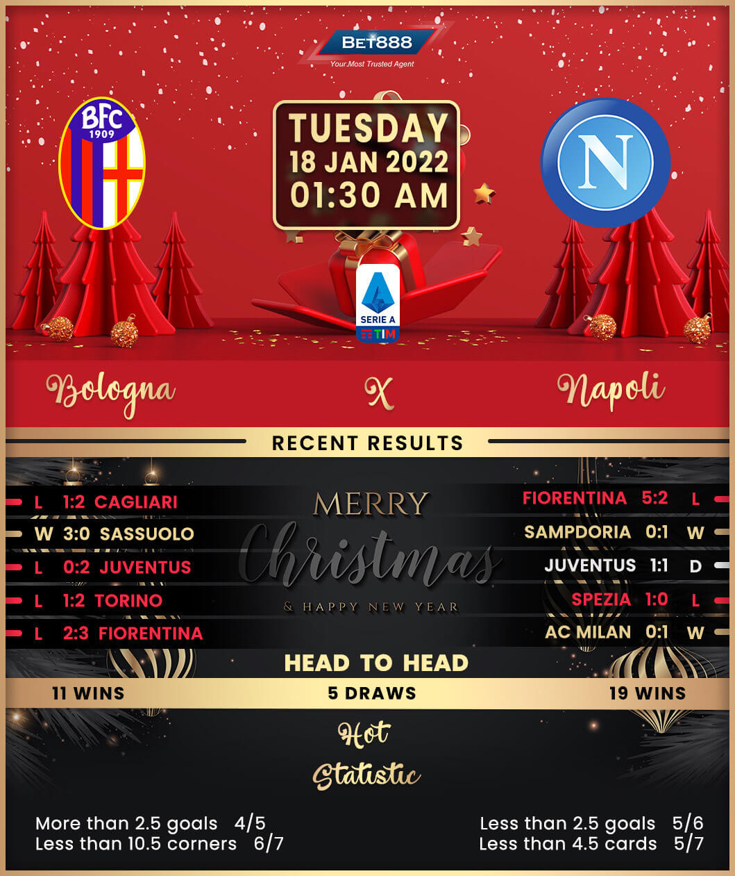 A growing injury list, compounded with Covid-related absences, saw Bologna collapse at Cagliari last time out (1-2), extending their Serie A run without a draw to 12 matches (W5, L7). Sinisa Mihajlovic’s men have now suffered four defeats in their last five league outings (W1), conceding an average of 2.25 goals per loss. After falling to a dismal 3-0 thrashing in the reverse fixture, Bologna face the prospect of drawing a blank in both seasonal meetings with Napoli in Serie A for the first time since 1977/78. Another unwanted record is there for the taking, as Mihajlovic could become the first Bologna manager since Roberto Donadoni in February-March 2017 to lose three consecutive Serie A home matches, having lost the last two in a row by an aggregate score of 5-2.