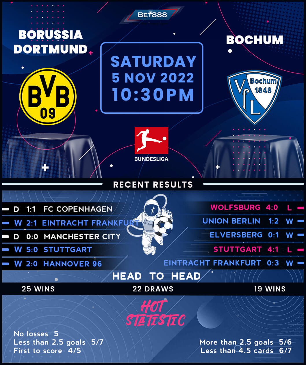 Meanwhile, Bochum’s last five Bundesliga matches have fluctuated between wins (3) and losses (2), keeping them embedded in a keenly-contested battle against relegation. Playing away from home has been Bochum’s ‘Achilles’ heel’ this season as they’ve lost all six league games on the road via an aggregate score of 19-4, conceding at least three goals in five! By extension, ‘Die Unabsteigbaren’ have failed to keep a clean sheet on any of their last 8 Bundesliga travels, the longest ongoing wait for an away shutout among teams currently in the league. But after claiming an eye-catching 4-3 win in this corresponding fixture last season, Bochum will feel confident about taking points off BVB in three consecutive Bundesliga games for the first time in 30 years.