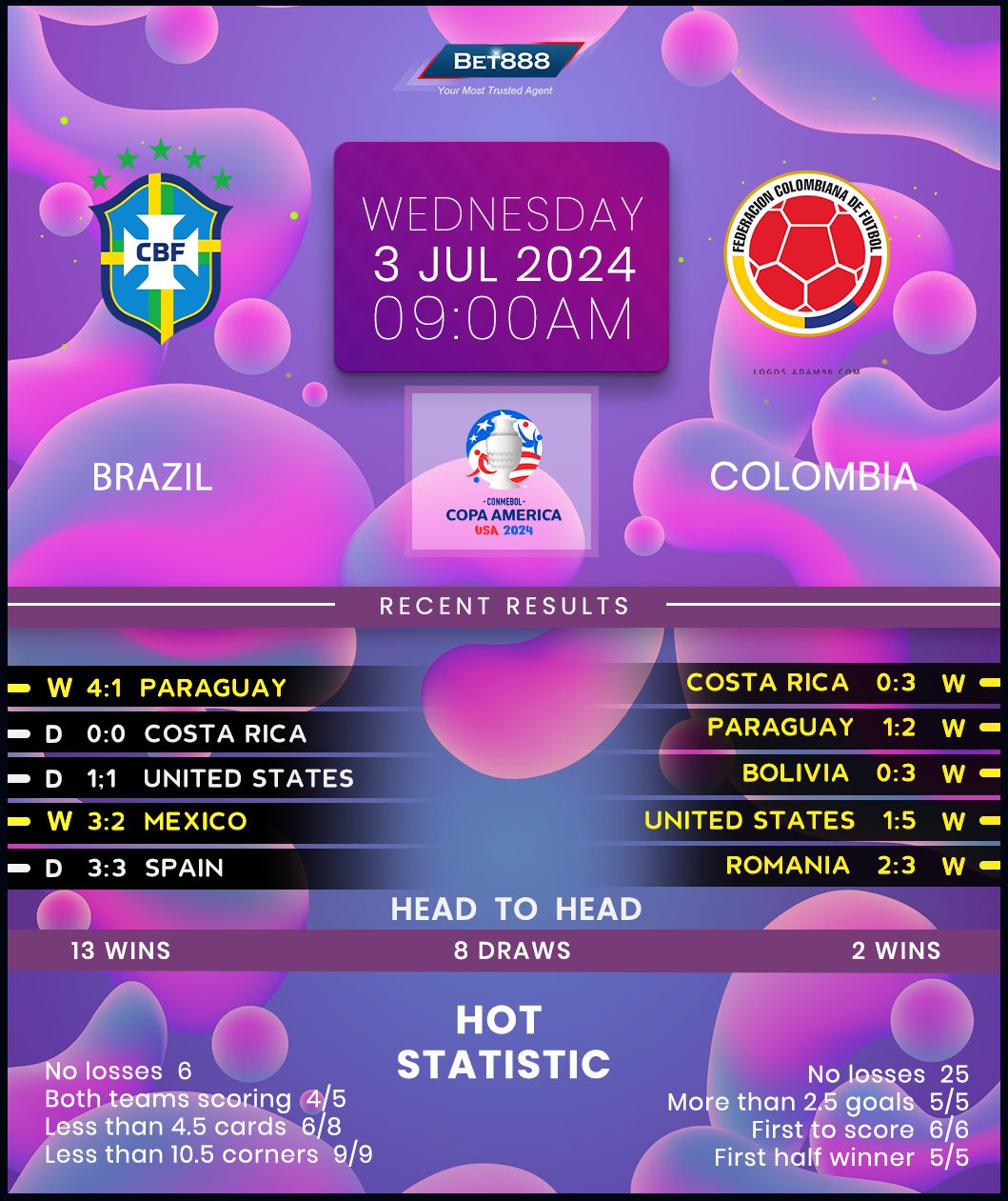Following an uneventful 0-0 draw against Costa Rica in their opening Group D outing, Brazil went from strength to strength in round two, thrashing Paraguay 4-1 to set one foot in the quarter-finals. Though a point would propel the Selecao into their third consecutive Copa America knockout stages, they’d be out to take all three and avoid meeting high-flying Uruguay in the next round. Yet to lose under new manager Dorival Junior in 2024 (W3, D3), the Brazilians will take the field in high spirits. Further confidence stems from their stellar record against upcoming opposition Colombia (W21, D11, L4), though one of those four defeats came in their latest encounter in November. Ominously for Brazil, two of the remaining three have arrived in the group phase of the Copa America.