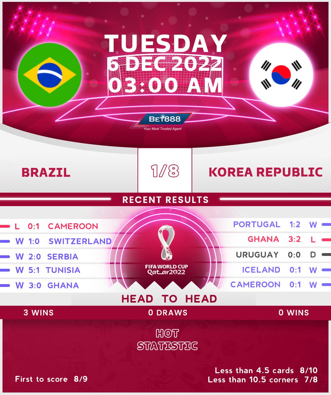Even though Brazil’s second-string line-up suffered a 1-0 defeat to Cameroon last time out, it wasn’t enough to prevent the five-time world champions from winning their World Cup group for the 11th consecutive campaign. Tite’s men started things off in Qatar with a 2-0 humbling of Serbia before eking out a 1-0 win over Switzerland without facing a single shot on target across those two matches. Heavily fancied to progress into the quarter-finals, the ‘Selecao’ boast an outstanding all-time H2H record against Korea Republic (W6, L1), including a 5-1 demolition in a friendly back in June. That should inspire Brazil’s hopes of getting back on the rails after Cameroon knocked them down from a jaw-dropping 17-match unbeaten streak in the World Cup group stages.