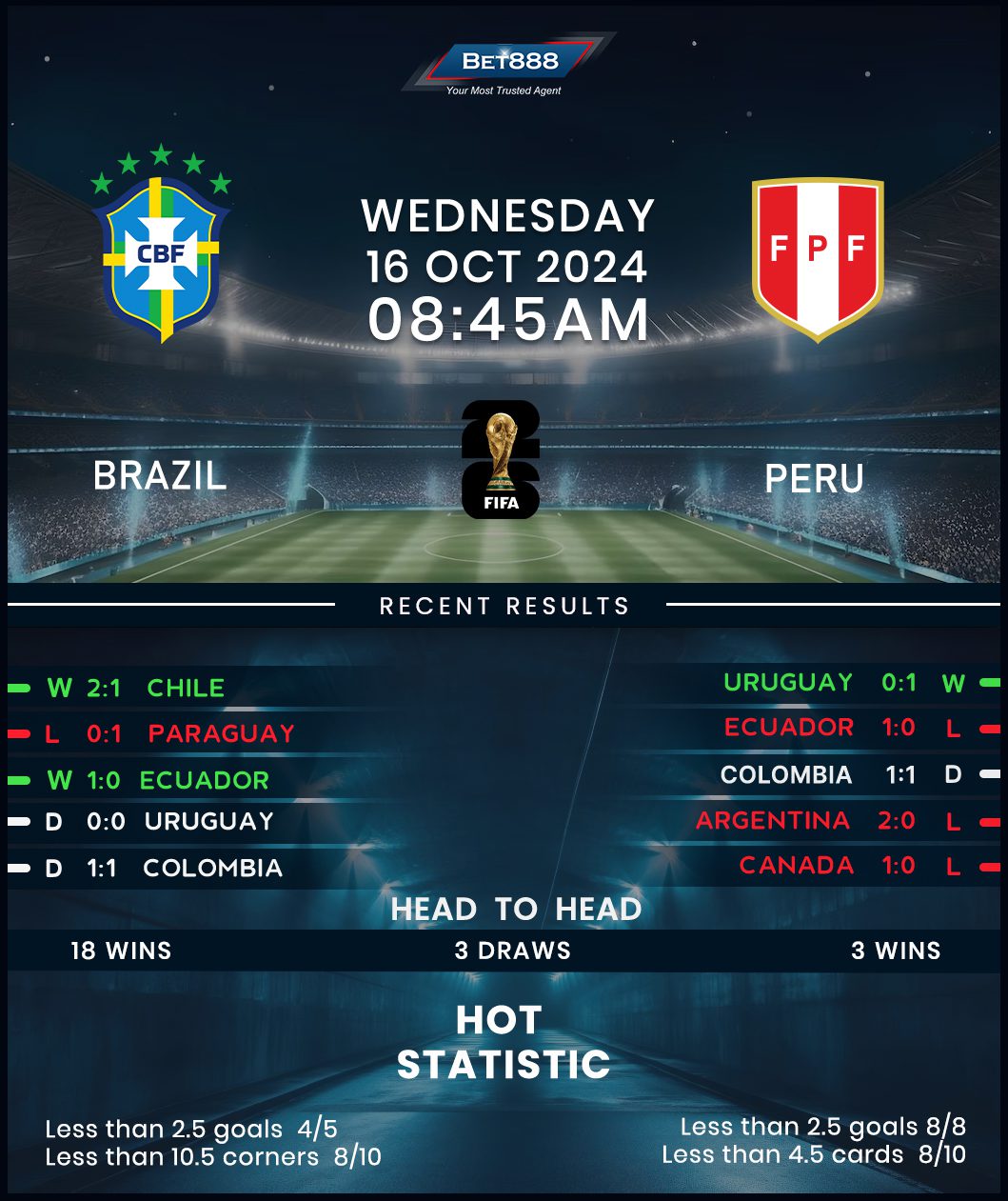 Nailed to second bottom of the CONMEBOL standings with just one win to their name (D3, L5), visiting Peru will hope to turn the tables on their more esteemed hosts and finally catch a break. Encouragingly for La Bicolor, their only win in the ongoing qualifying cycle came last weekend as they stunned Uruguay 1-0 at home. A lack of first-half action has been a running theme in Peru’s recent matches, with the last seven goals they’ve scored/conceded coming in the second half. Manager Jorge Fossati will rely on that stubbornness in Brasília, with his side bidding to defy an underwhelming run of just one win from their last seven international travels (D1, L5). Ominously, five of their six most recent road trips have seen Peru fail to get on the scoresheet.