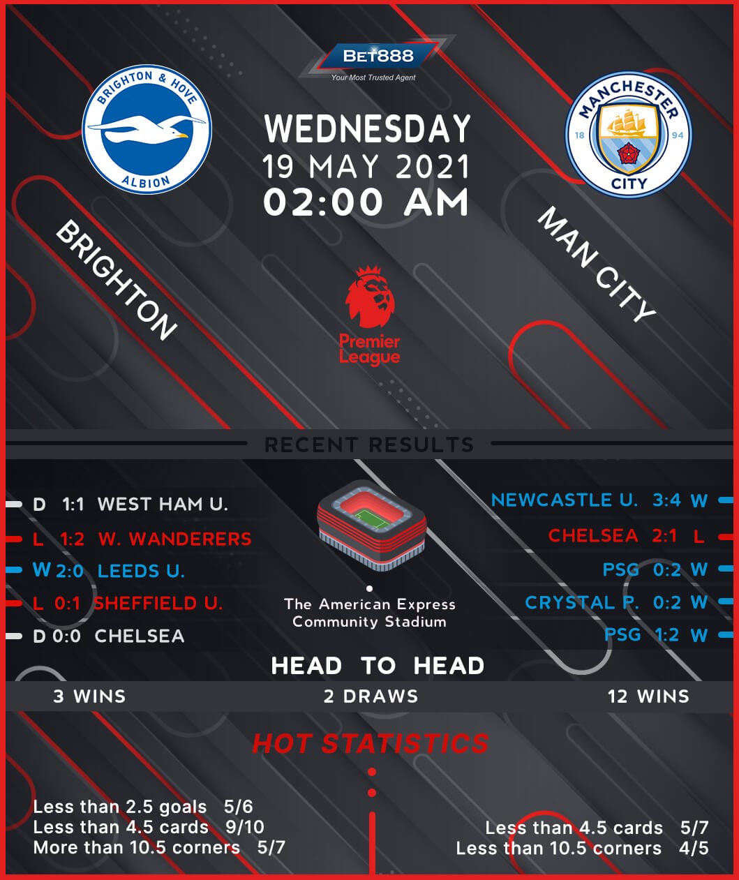 Brighton & Hove Albion and Manchester City go head-to-head at the Amex Stadium in the penultimate round of the 2020/21 Premier League season.