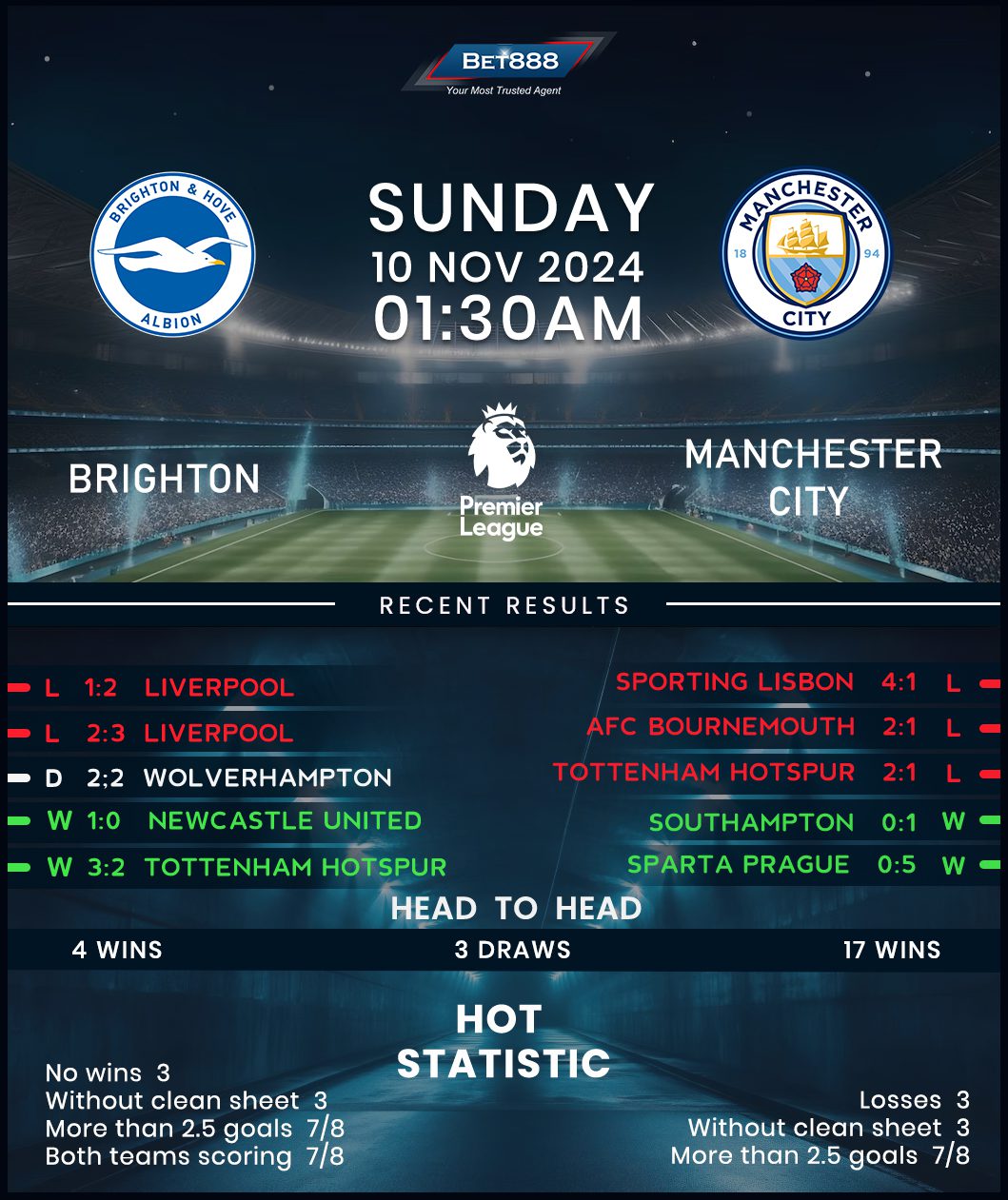 Amex Stadium is the venue as Brighton & Hove Albion and Manchester City go head-to-head in an exciting Premier League meeting.
