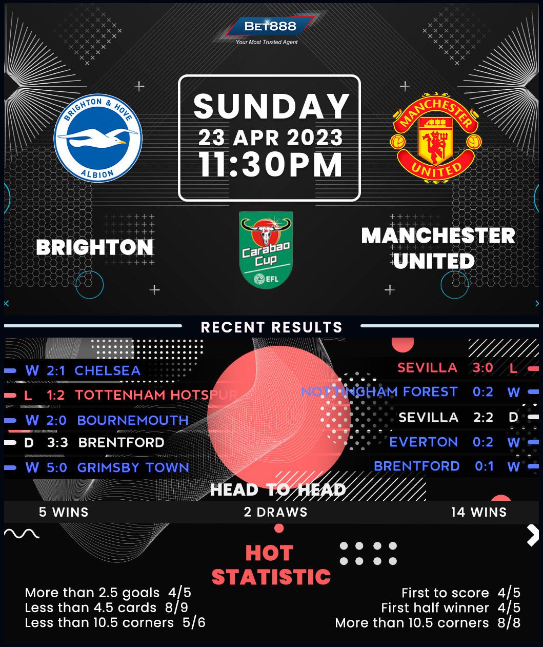 Brighton thrashed lower-league Grimsby 5-0 in the quarter-finals to secure only their third appearance in the FA Cup semi-finals. That result forms part of their impressive nine-game form in all competitions (W6, D2, L1). However, the ‘Seagulls’ have never won a competitive fixture at Wembley, drawing one and losing four of their previous five visits to this venue. On a more positive note, Roberto De Zerbi’s men have defeated Manchester United in their last two competitive H2Hs, as many victories as they had in their previous 16 (D2, L12). They should be confident of adding a third win to the tally following a morale-boosting 2-1 Premier League triumph at Chelsea last weekend.