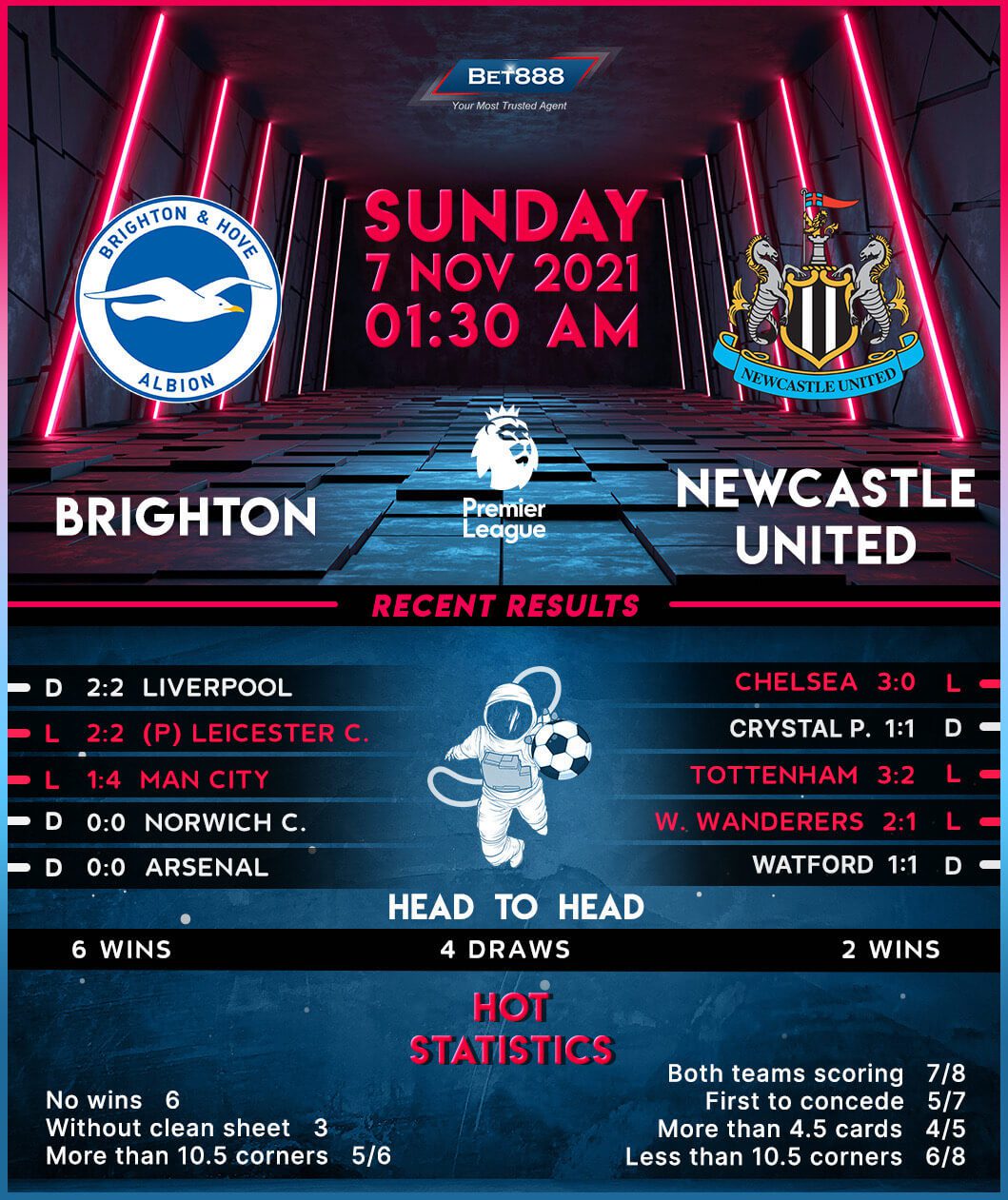 Despite going from back-to-back Premier League victories to five consecutive league matches without winning (D4, L1), Brighton can draw confidence from holding Liverpool to a 2-2 away draw last time out despite trailing 2-0 at one point. Graham Potter’s men will be confident of getting back to winning ways here, as they take on a Newcastle side they haven’t lost to in any of their eight Premier League H2Hs (W4, D4), conceding just once across those meetings! Brighton hammered Newcastle 3-0 in both last season’s Premier League encounters, with their previous six top-flight H2Hs featuring just four goals combined. However, the ‘Seagulls’ have struggled in low-profile fixtures of late, picking up just four victories across their last 26 Premier League matches against sides starting the day in the drop zone (D12, L10).